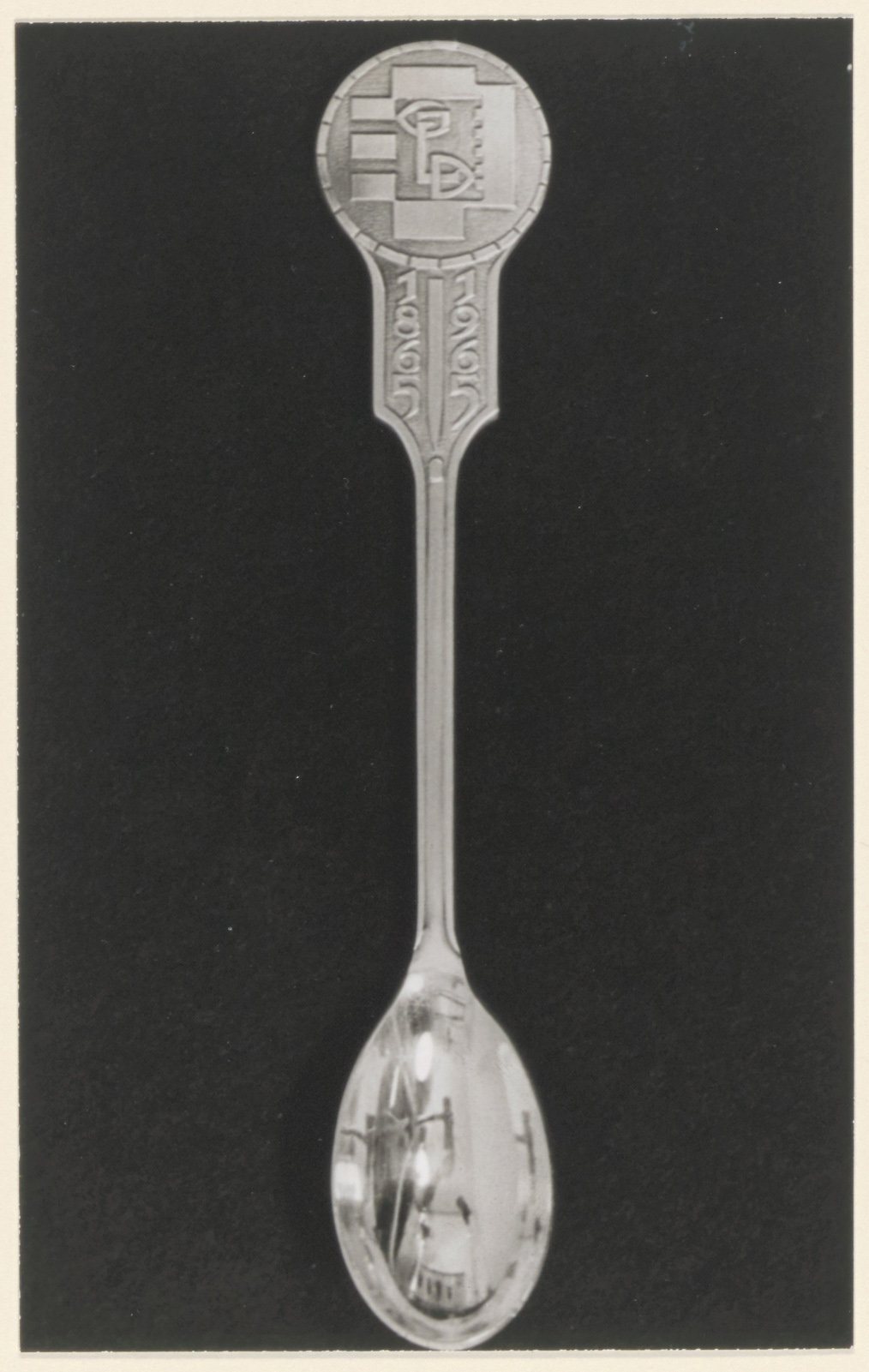 - Lepeltje met inscriptie ter herinnering aan het 100-jarig bestaan van het Gemeente Lyceum. Inscriptie: GLD 1865 - 1965 met de plattegrond van de school aan de Noordendijk.