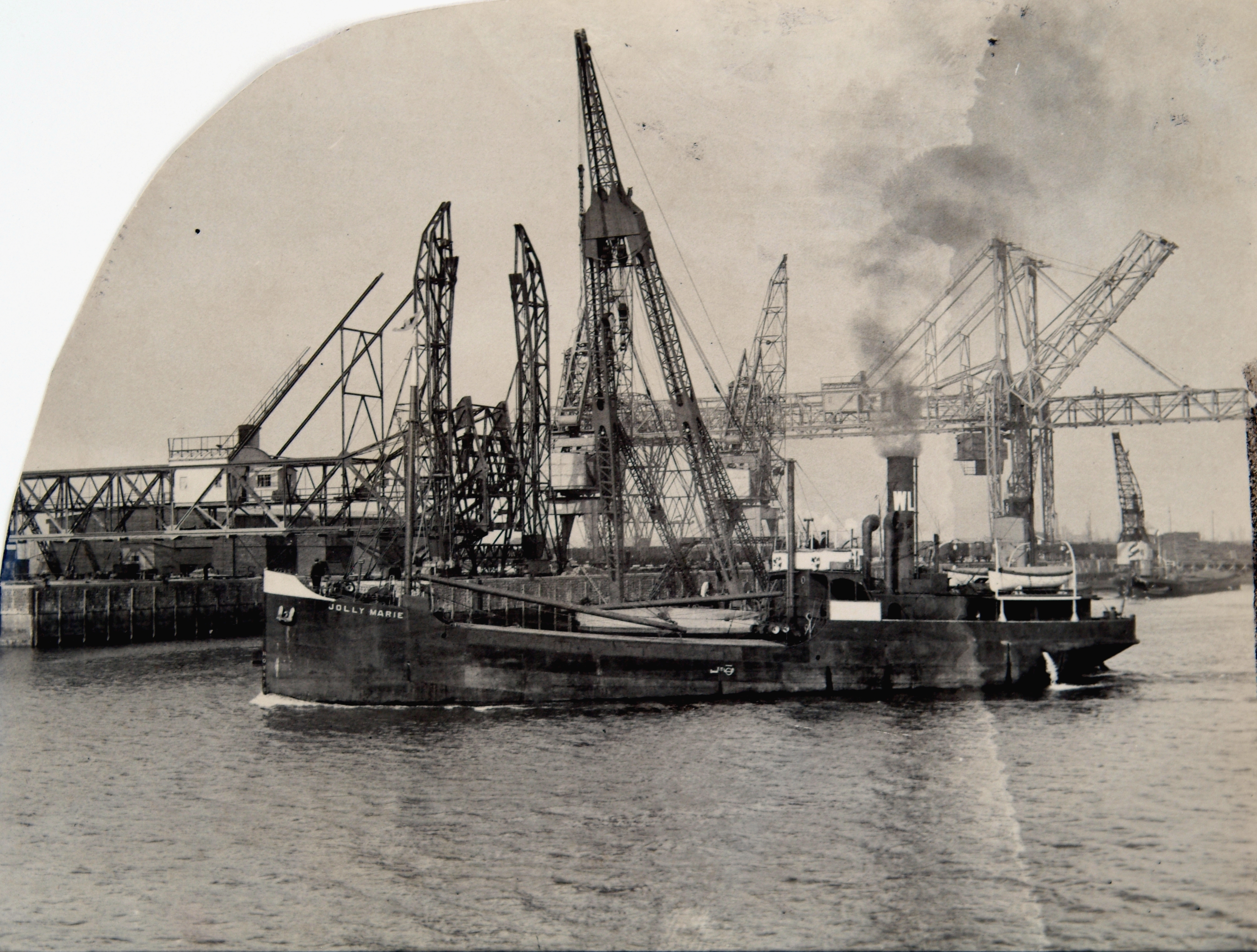 De "Jolly Marie" bij de loskranen in de Zeehaven. Met dit schip werd op 1 maart 1930 de …