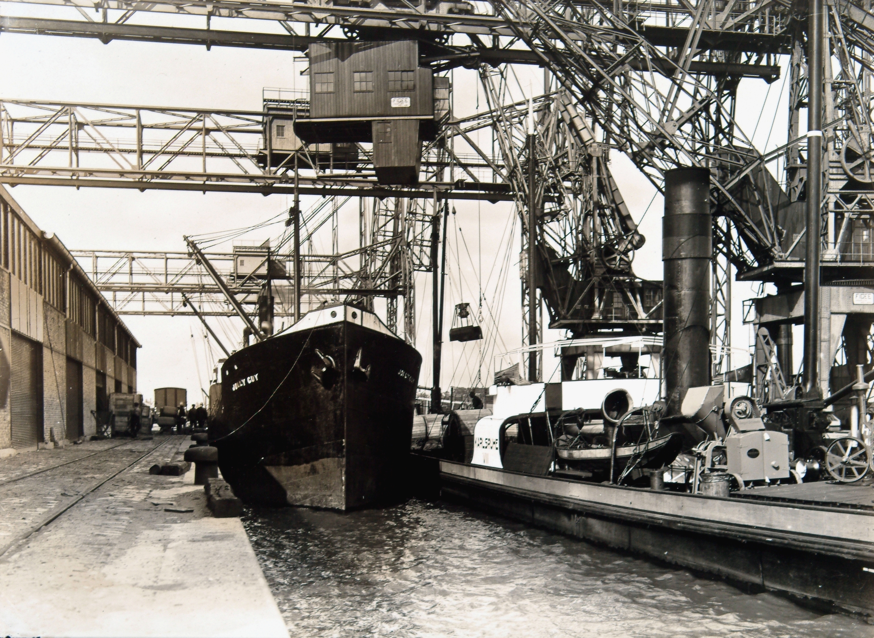 De Zeehaven, waar het Engelse vrachtschip "Jolly Guy" wordt gelost en het Duitse schip "Karlsruhe" wordt geladen.