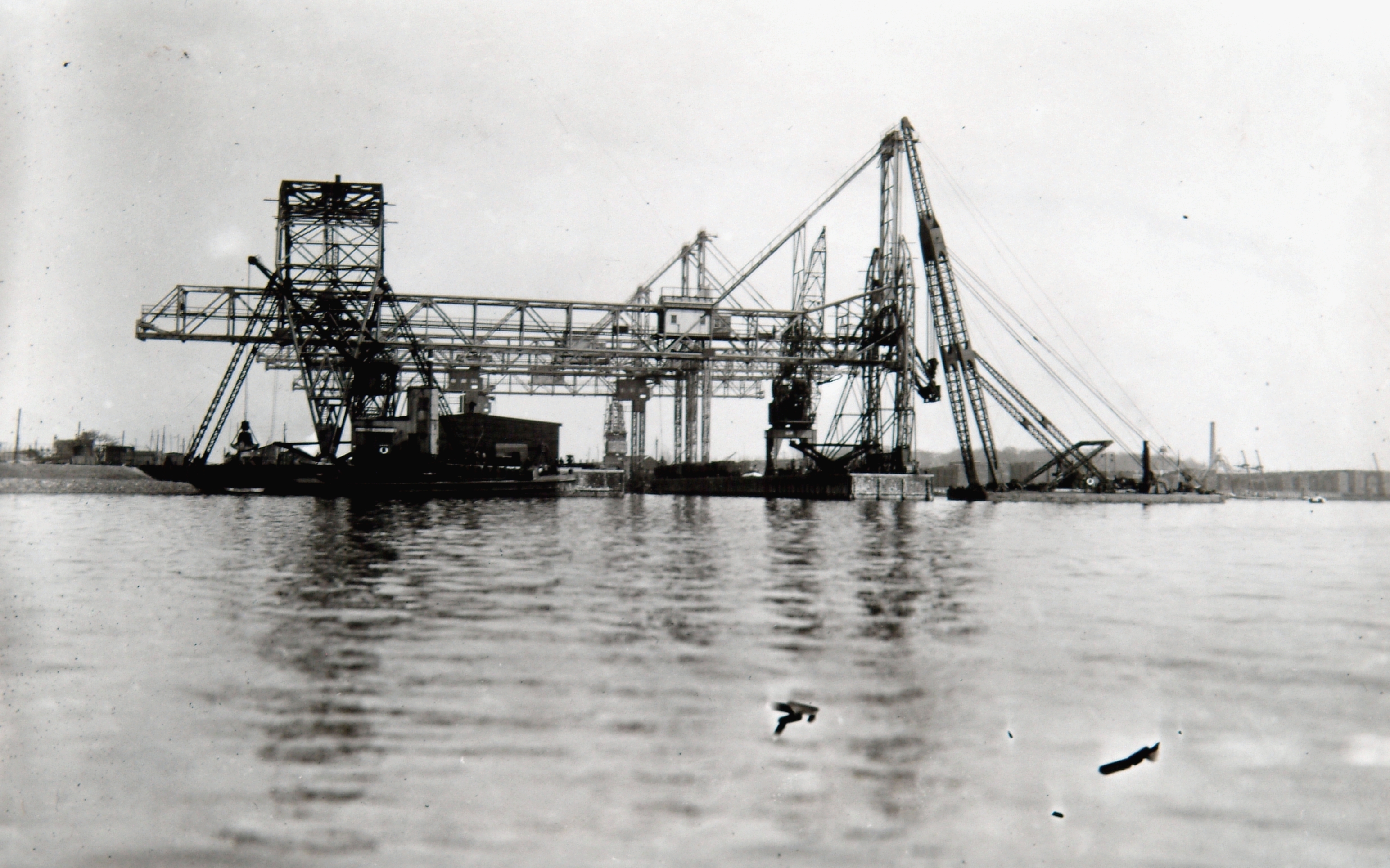 - Met drijvende bokken worden de loopkranen voor de overslag van goederen geplaatst aan de nieuw gegraven Zeehaven.