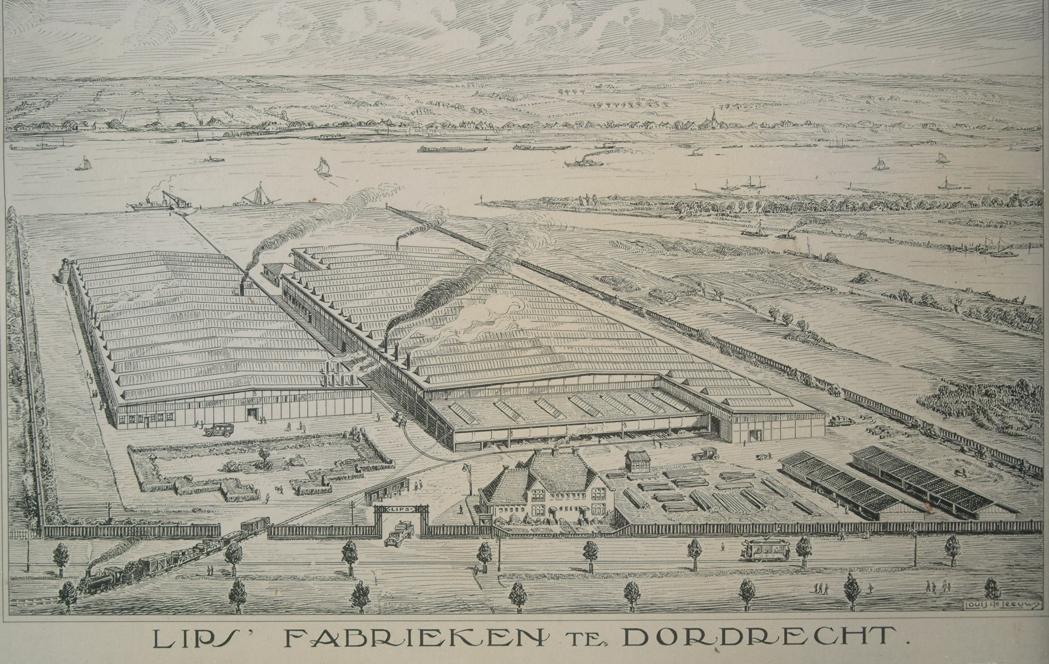 - Vogelvluchtimpressie van het fabriekscomplex van de brandkasten- en slotenfabriek van Lips aan de Merwedestraat 1922 Links de slotenfabriek, rechts de brandkastenfabriek; het kantoorgebouw op de voorgrond is wegens geldgebrek niet gerealiseerd