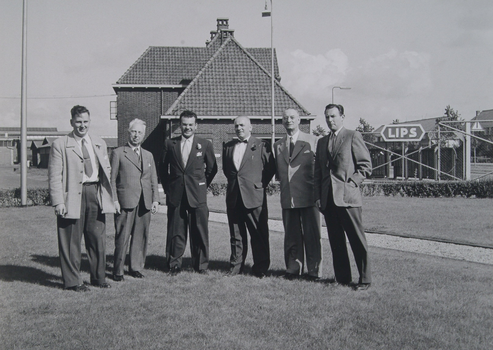 - Groepsportret van directie en bezoekers van de Lips fabriek aan de Merwedestraat voor de poort. V.l.n.r. J. van der Spek, J.Lips, E. Harter, B. Murray, V. Eras en B. Lips