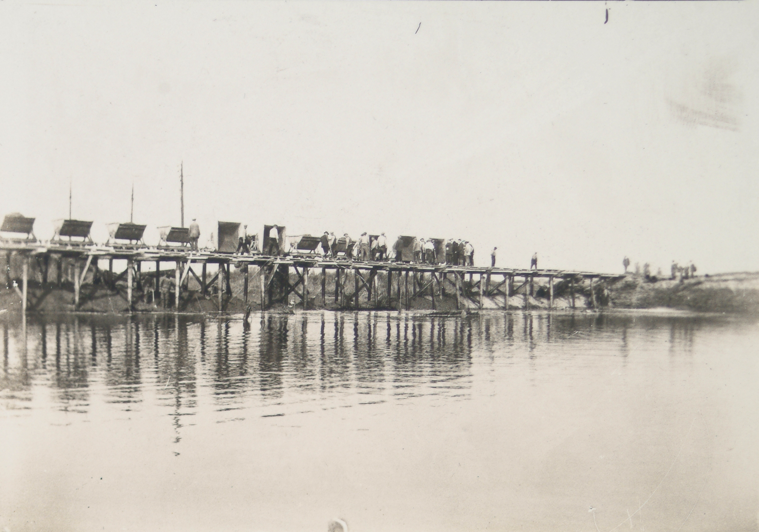 Een rij op rails staande kiepkarren bij de inpoldering van de Dordtsche Biesbosch.