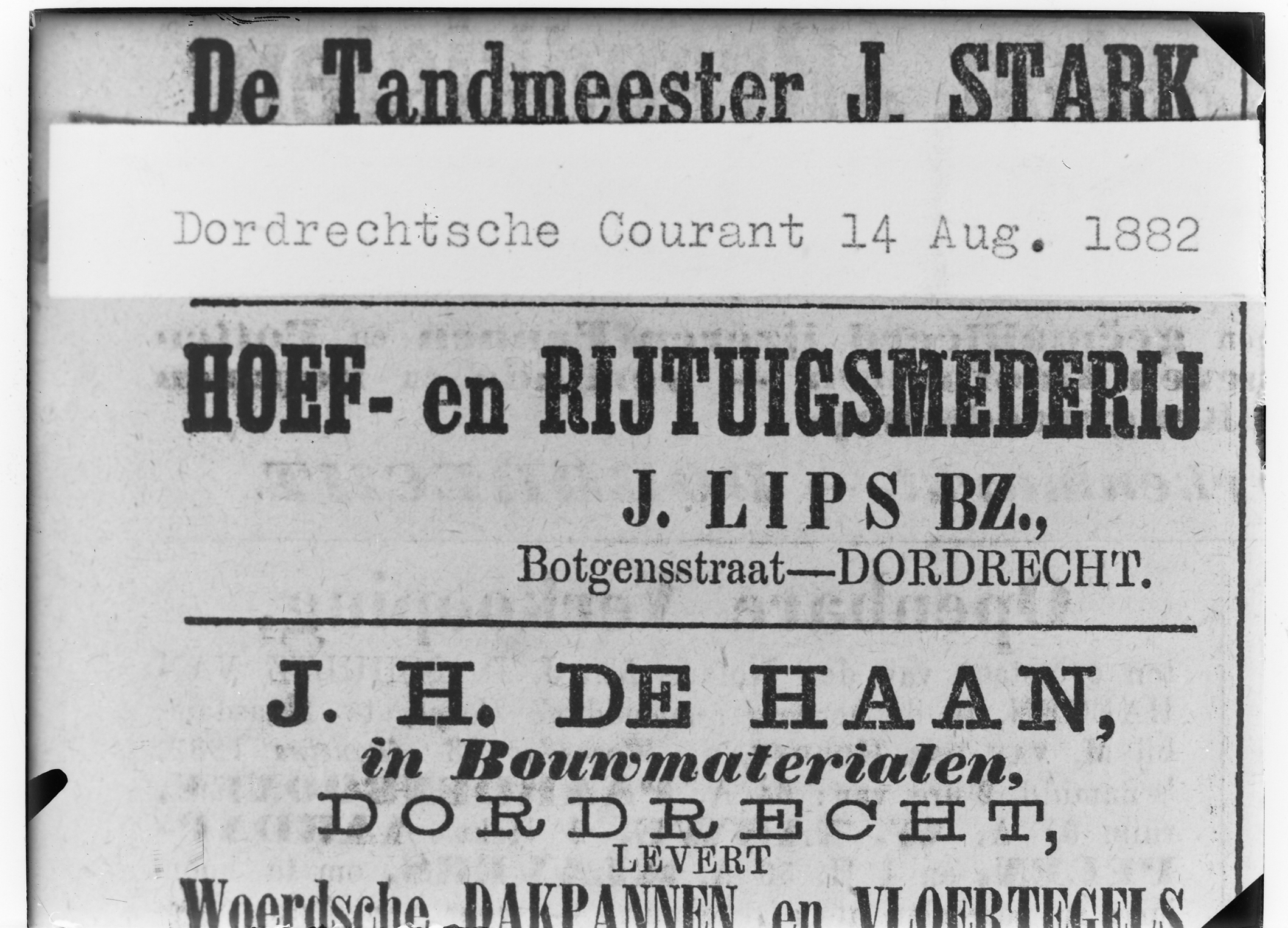 Krantenadvertentie van J. Lips Hoef- en Rijtuigensmederij aan de Botgenstraat uit 1882