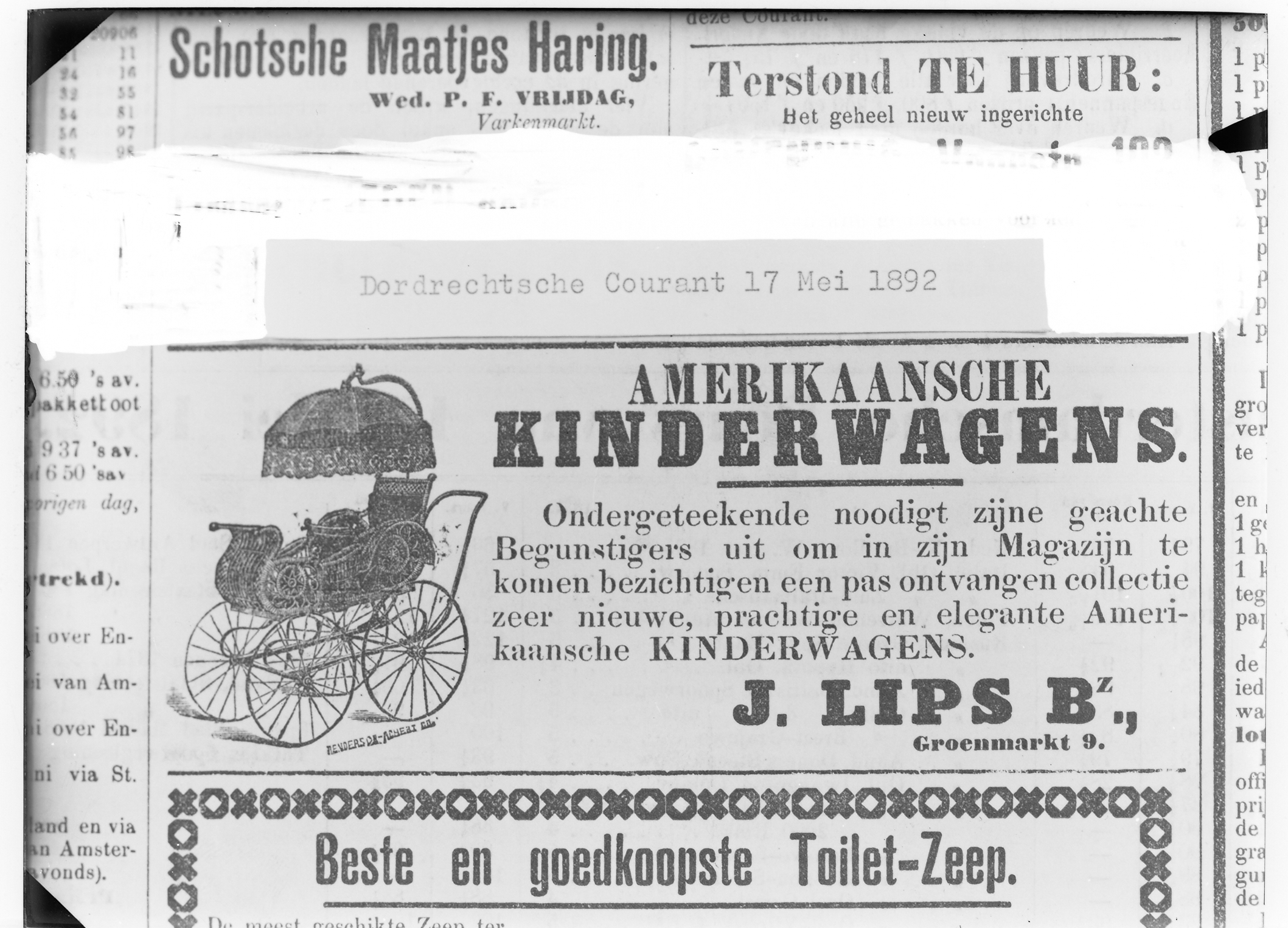 - Krantenadvertentie uit 1892 van J. Lips Hoef- en Rijtuigensmederij, voor het bekend maken dat hij Amerikaanse kinderwagens verkoopt