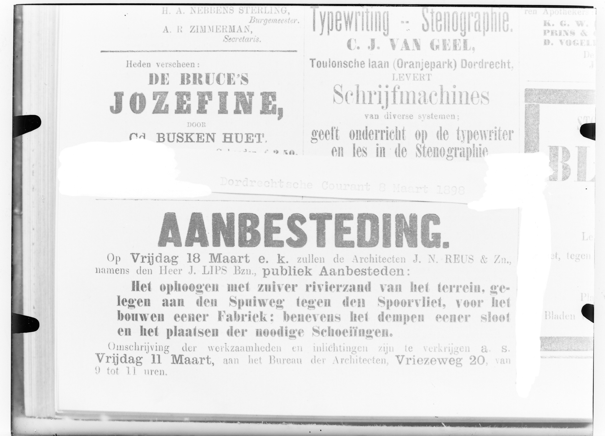 - Krantenadvertentie uit 1898 van J. Lips (voorheen Hoef- en Rijtuigensmederij) met informatie over de nieuw te bouwen fabriek