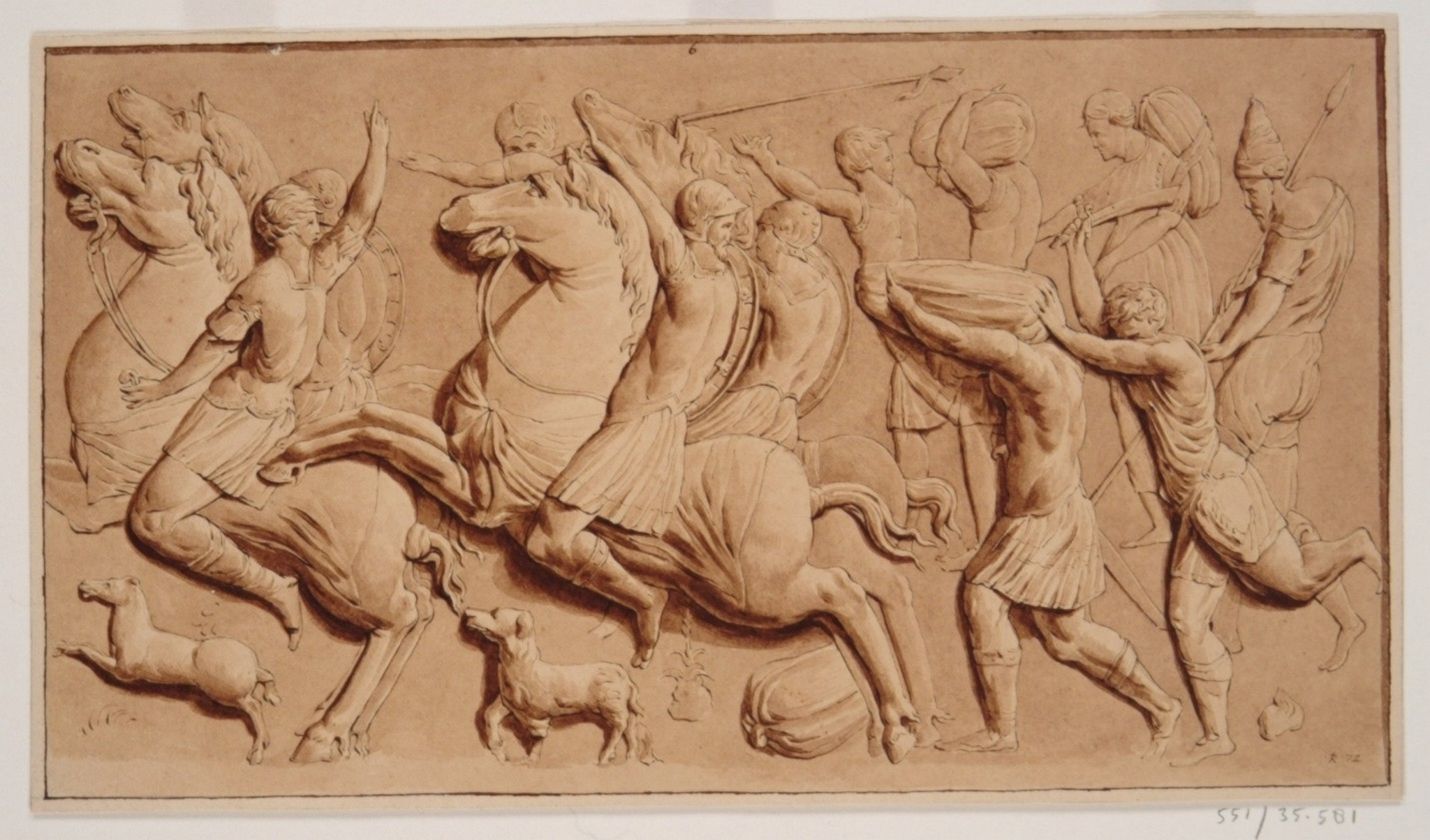 Grote Kerk - de Koorbanken, Noord- of Evangeliezijde: 16,5 paneel in de achterwand van de banken met een voorstelling van een Romeinse zegetocht. Paneel 7: vier Romeinen te paard, gevolgd door slaven die de buit dragen