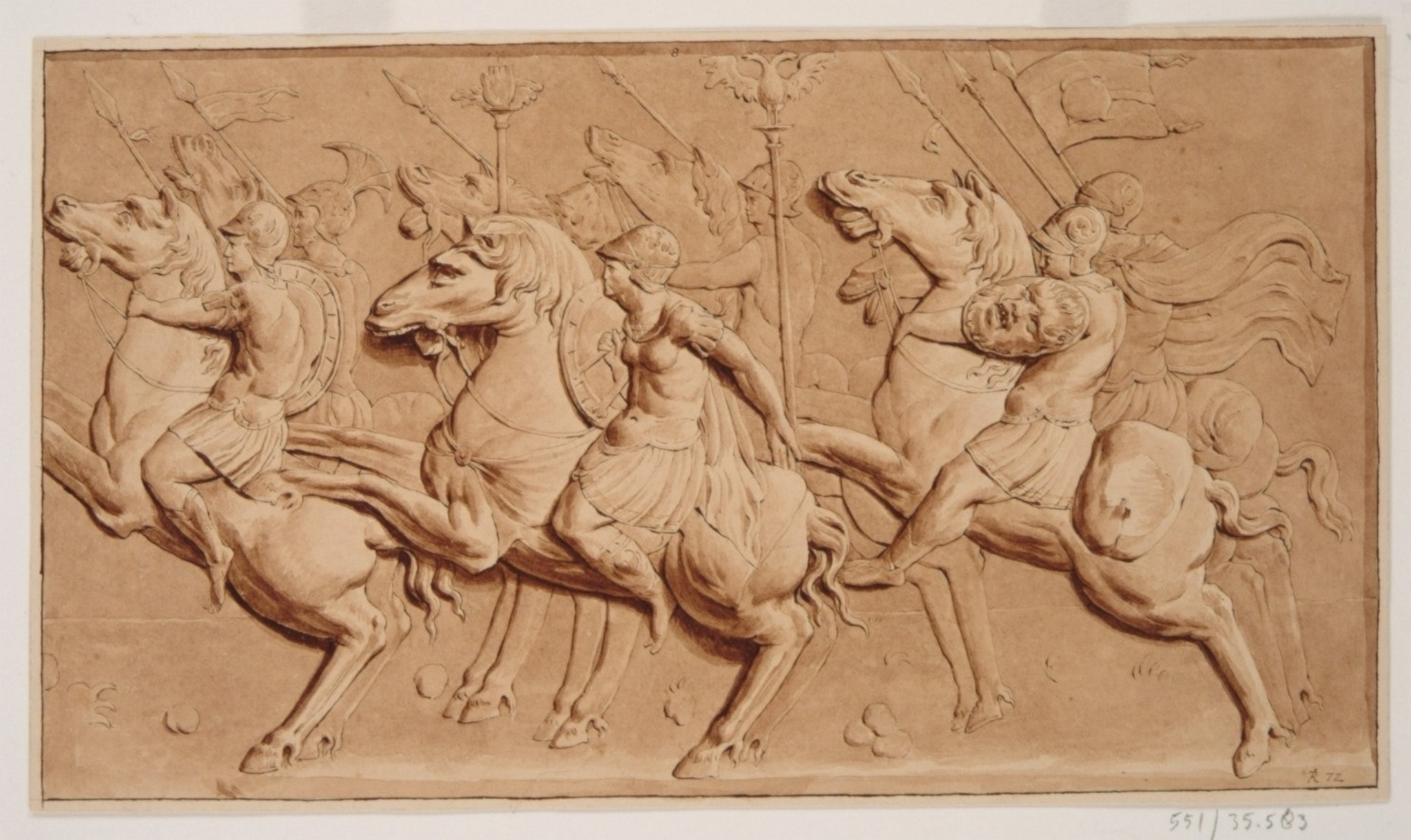 Grote Kerk - de Koorbanken, Noord- of Evangeliezijde: 16,5 paneel in de achterwand van de banken met een voorstelling van een Romeinse zegetocht. Paneel 9: een zestal met lansen en schilden gewapende Romeinen te paard