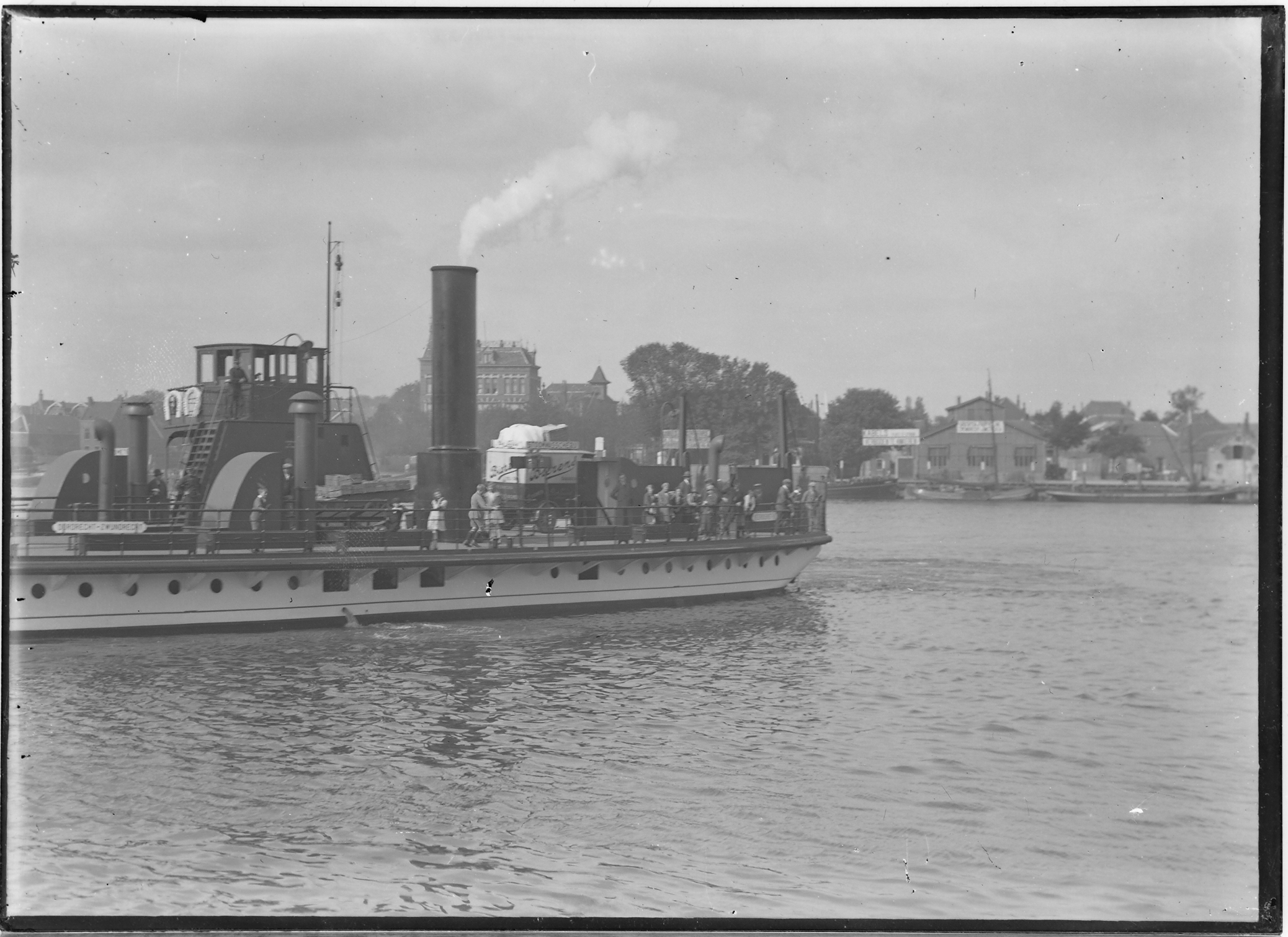 - Veerstoomdienst van Dordrecht naar Zwijndrecht op de Oude Maas met Zwijndrecht op de achtergrond. Achter de schoorsteen van de boot hotel Het Witte Paard