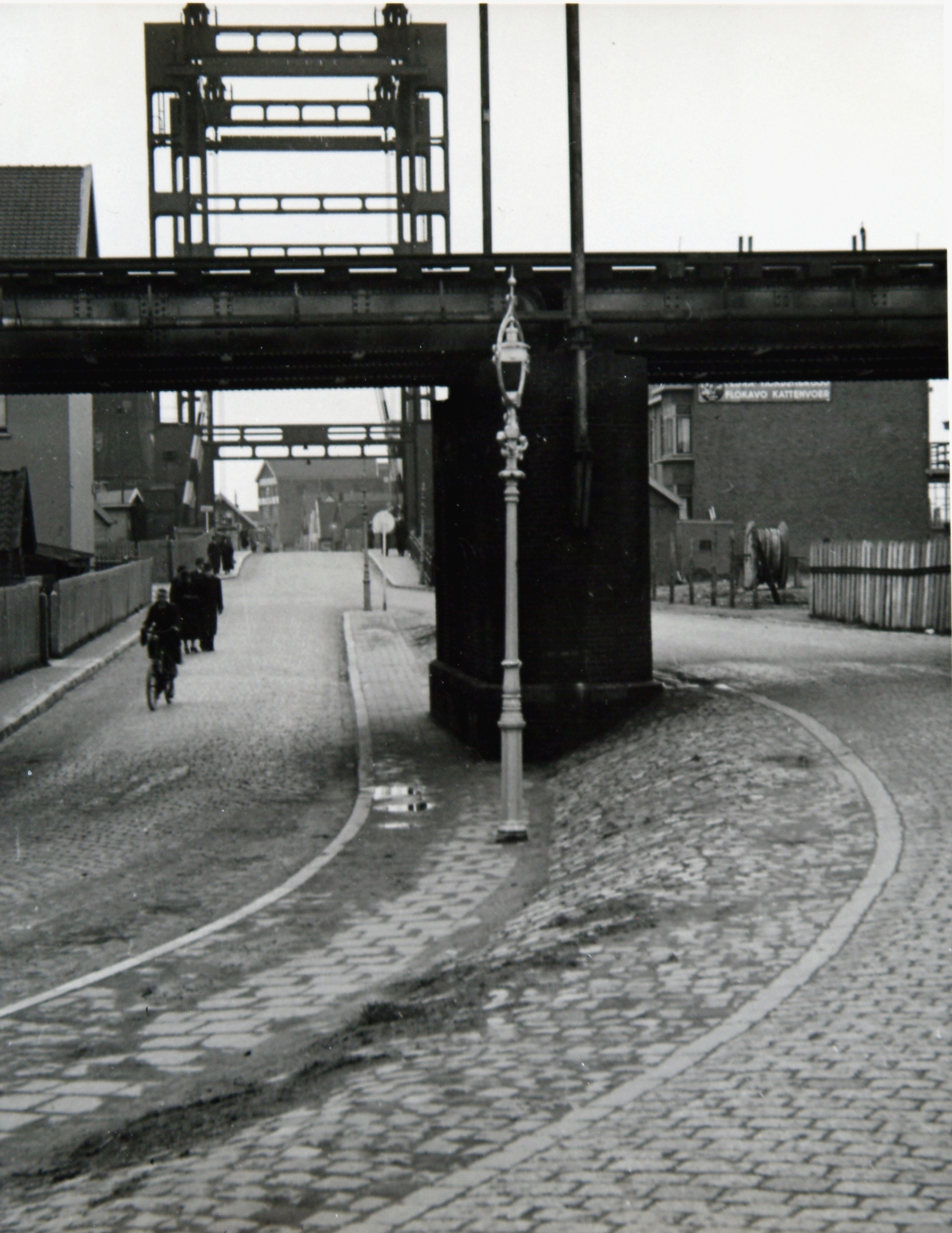 - Gezicht op de Dokweg en de Dokbrug in de richting van de 's-Gravendeelsedijk. Op de voorgrond de spoorbrug over de Oude Maas