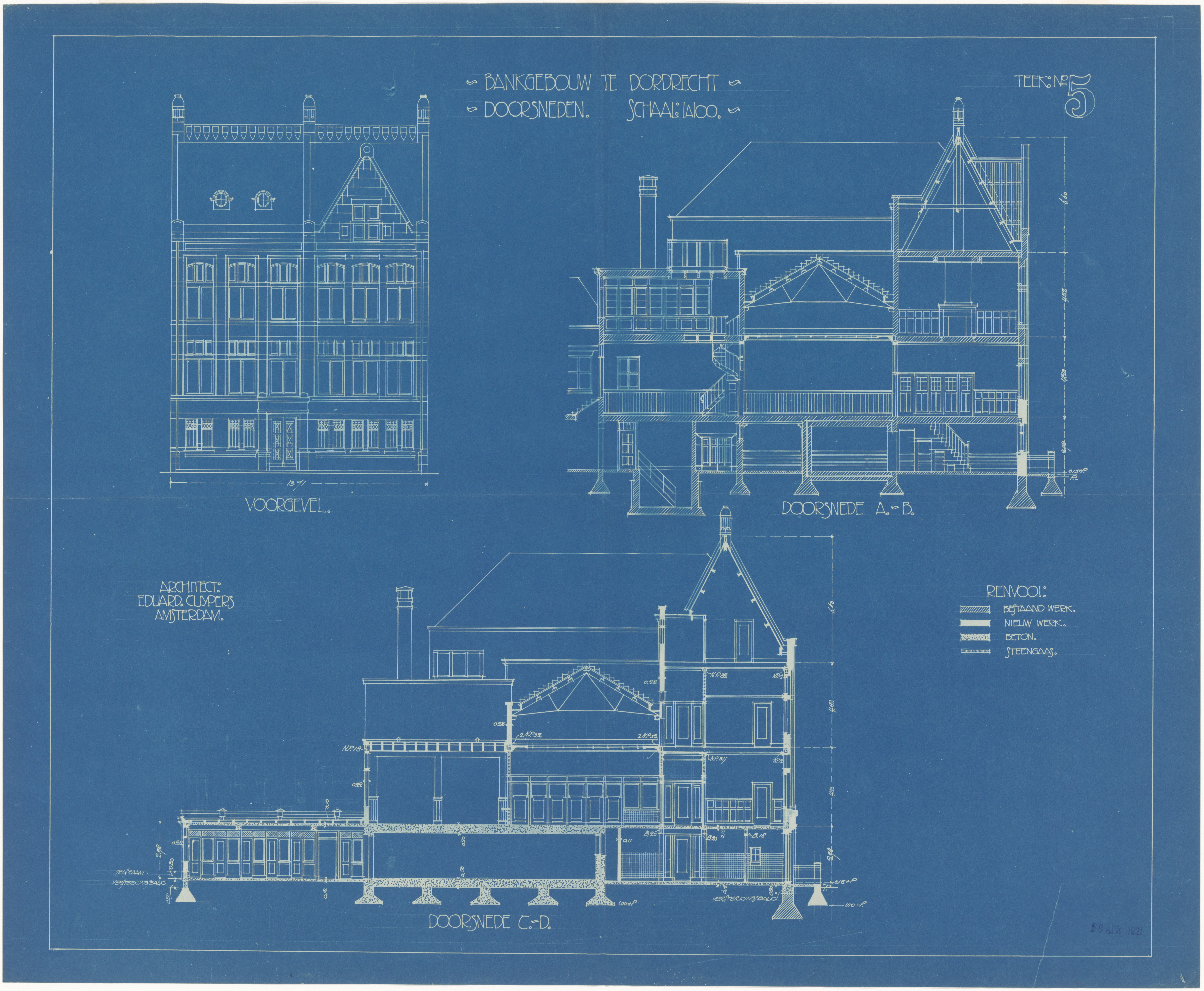 - Bouwtekening en aanbestedingsvoorwaarden voor de uitbreiding van een bankgebouw aan de landzijde van de Wijnstraat aan het Scheffersplein.