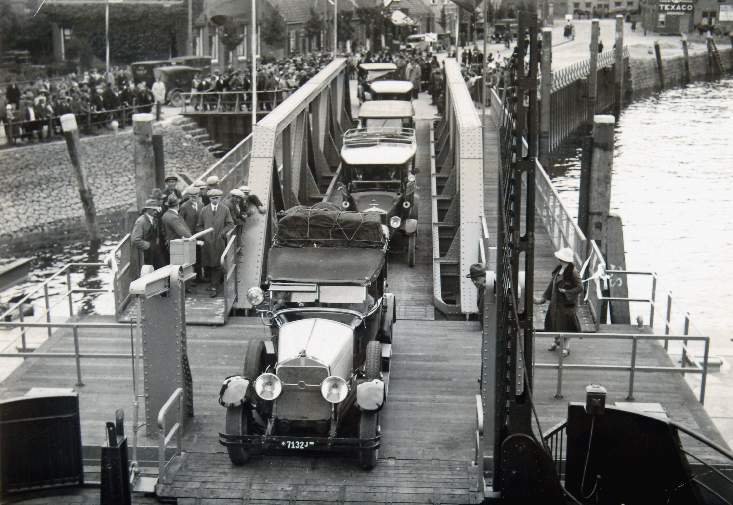 Ik vermoed toch dat je dit veel specifieker kan duiden, aan de hand van Ton’s eerste commentaar hieronder. Dit lijkt me de openingsdag, 19 juni 1928, en de eerste auto die het veer oprijdt. Inderdaad met een Zwitsers nummerbord, maar ik meen dat het een Rolls Royce Phantom Dual Cowl Tourer is. Engelser worden ze niet denk ik, dus de opmerking in de krant klopt in die zin. Verder zijn bij de rechter voetgangerstoegang duidelijk de resten van het doorgeknipte witte lint te zien en als je dat weet zie je links ook de restjes.