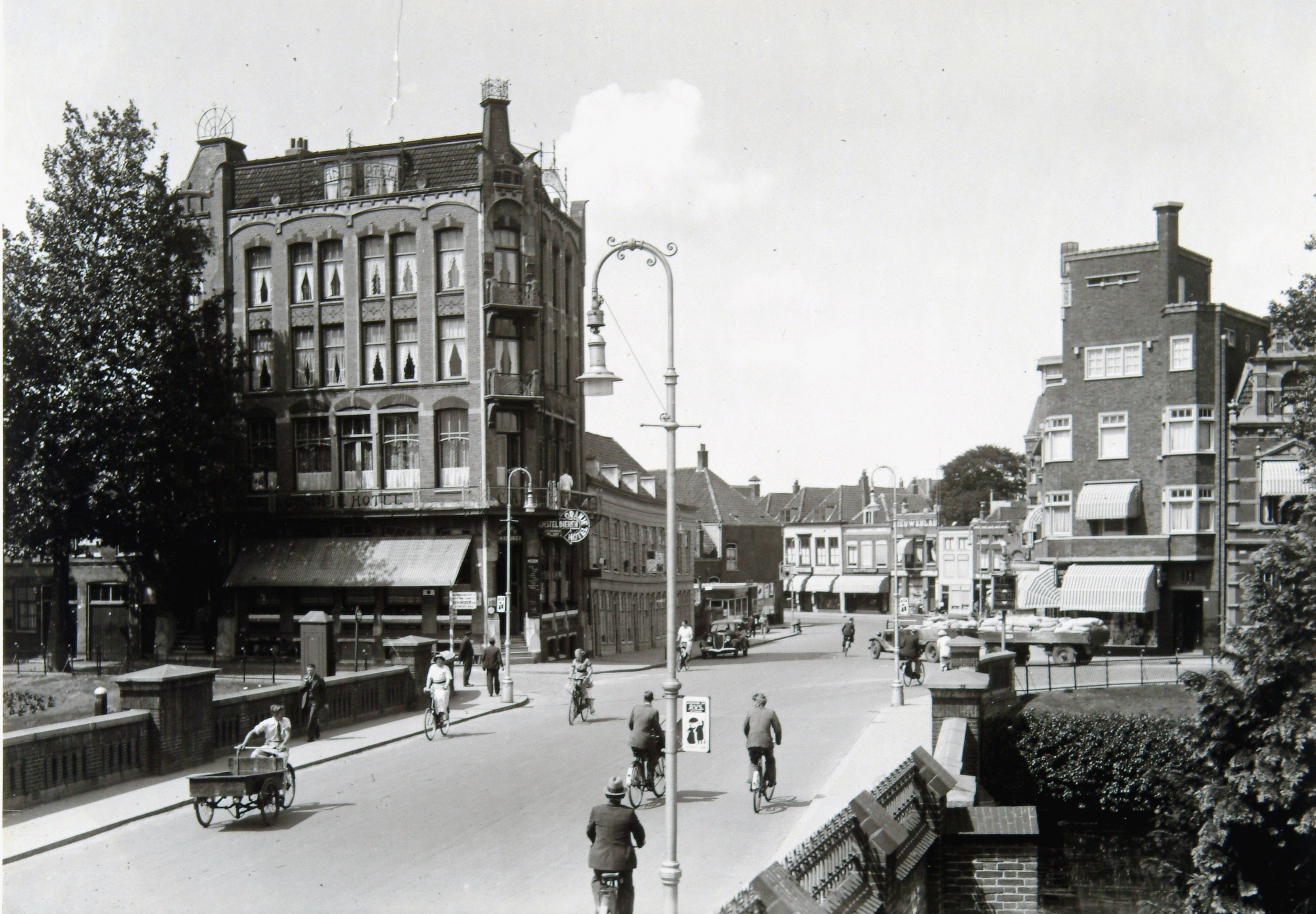- Johan de Wittbrug en een gedeelte van de Johan de Wittstraat in de richting van het Bagijnhof. Links het Oranjehotel op de hoek Vest/Johan de Wittstraat.