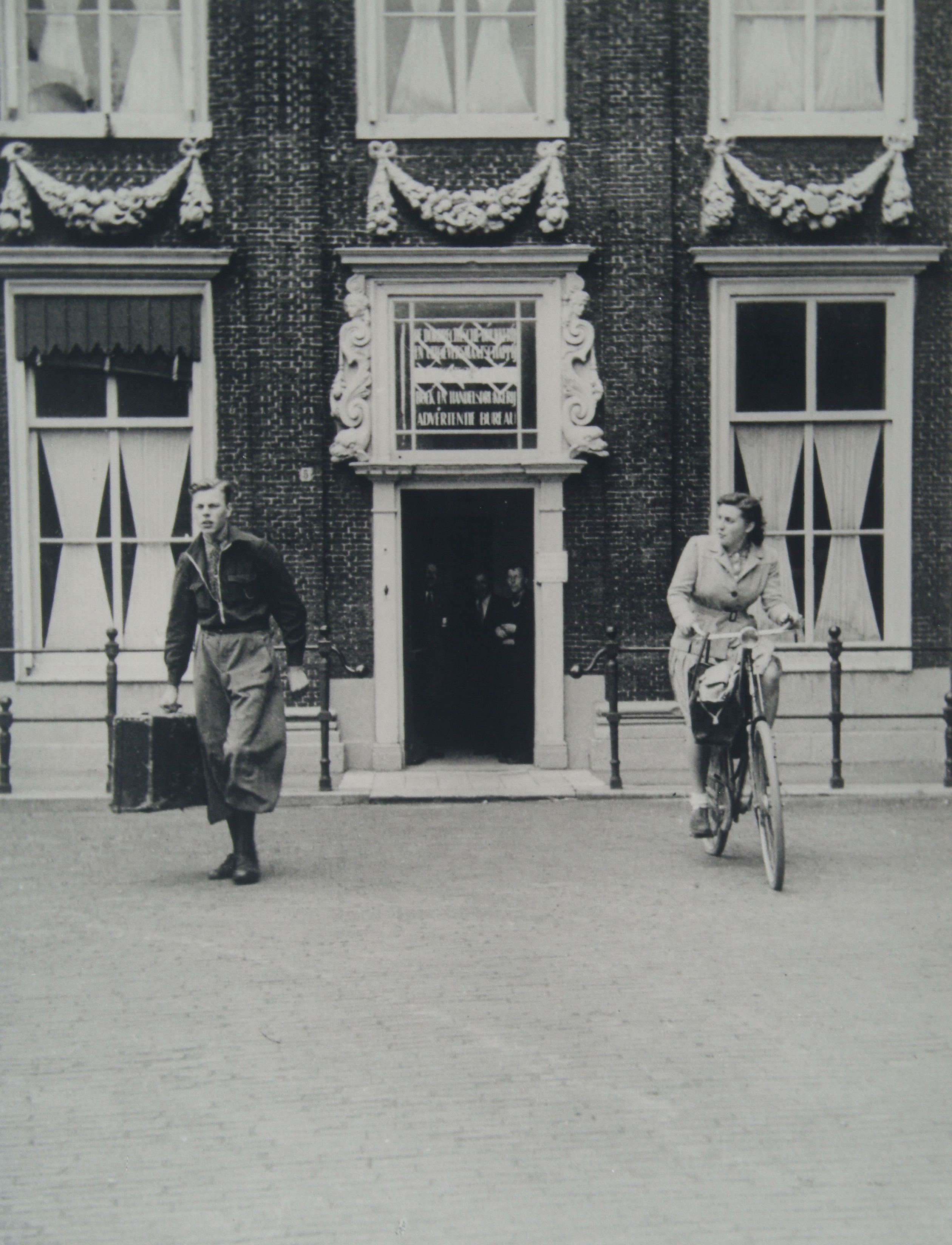 - De koerier van het illegale Trouw en de koerierster van het eveneens illegale krantje Het Nieuws verlaten de drukkerij aan het Grotekerksplein op de hoek van de Kerkstraat ca. 1942
