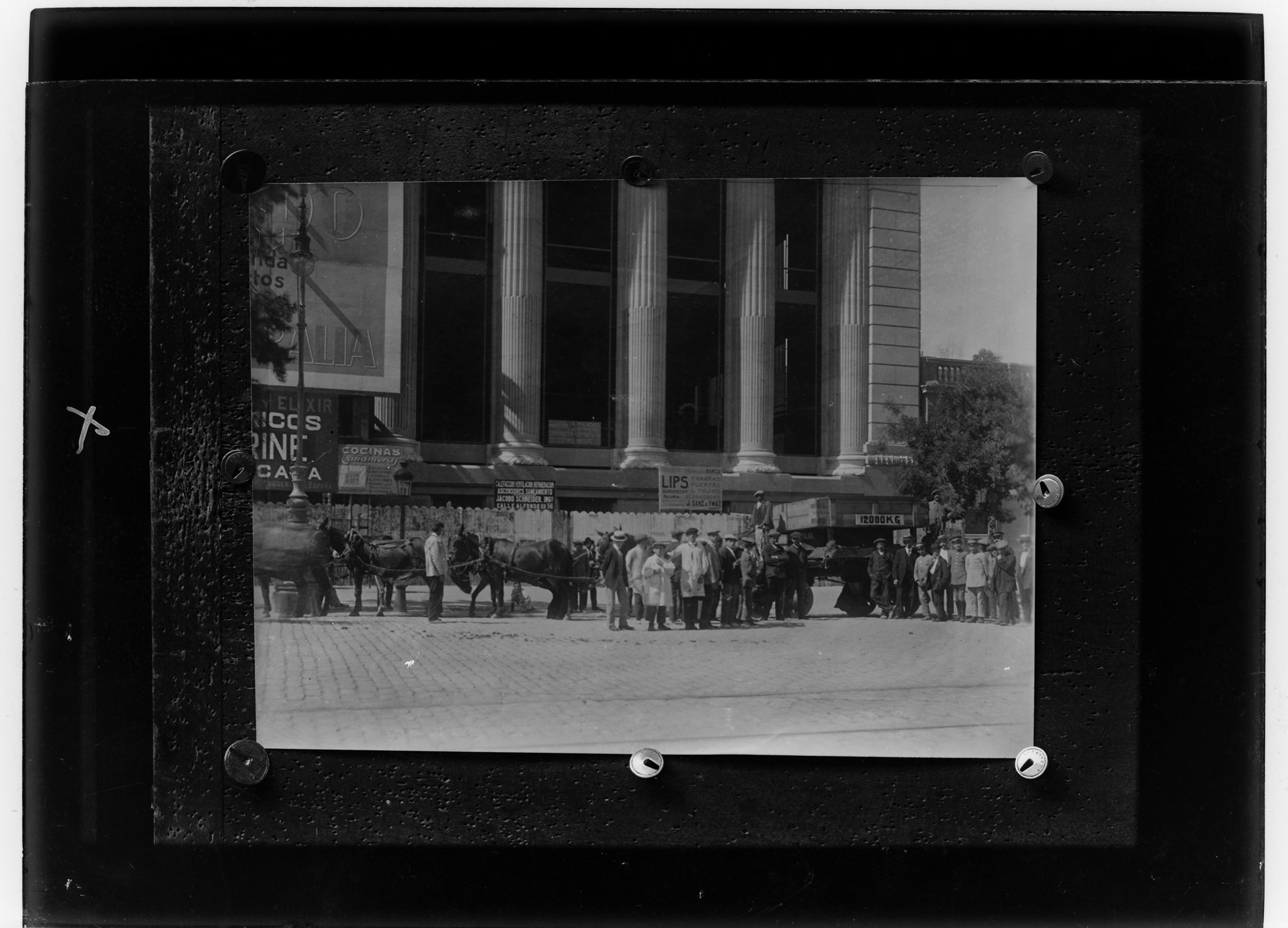 Transport van een ronde kluisdeur van 12.000 kg door paard en wagen en werknemers van de fabriek van Lips in Milaan