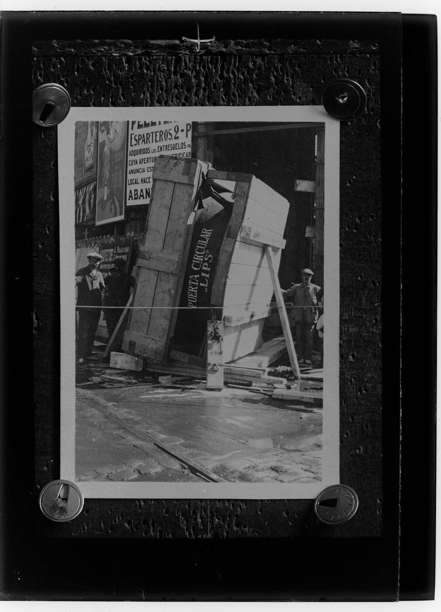 Transport van een ronde kluisdeur van 12.000 kg door werknemers van de fabriek van Lips in Milaan