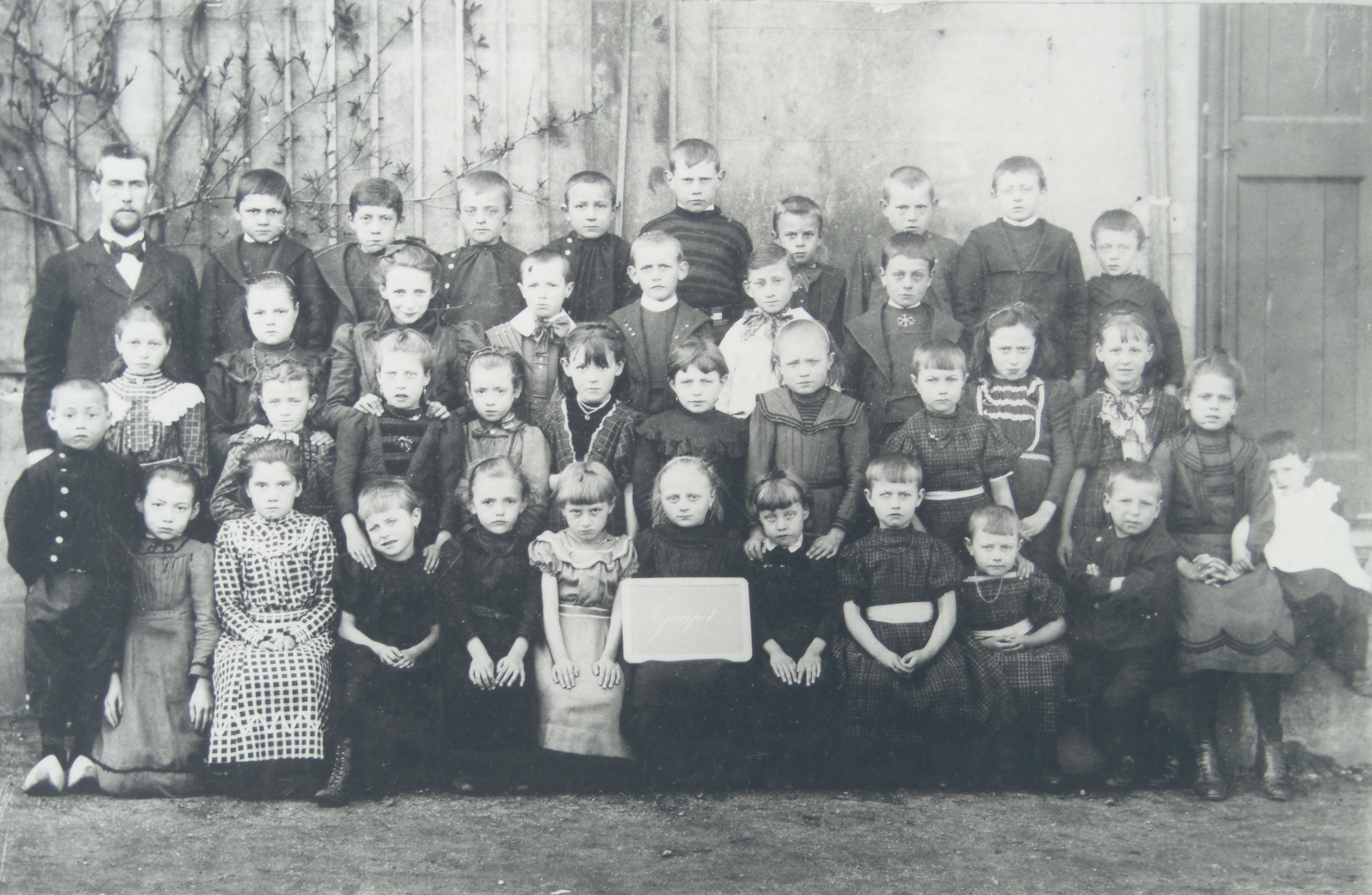 - Groep 1 van de lagere school aan de Mijl (?) of Dubbeldam. Bovenste rij 1e van rechts Wim Erkelens, 2e van rechts Jacob van Erkelens, links hoofdonderwijzer Moren