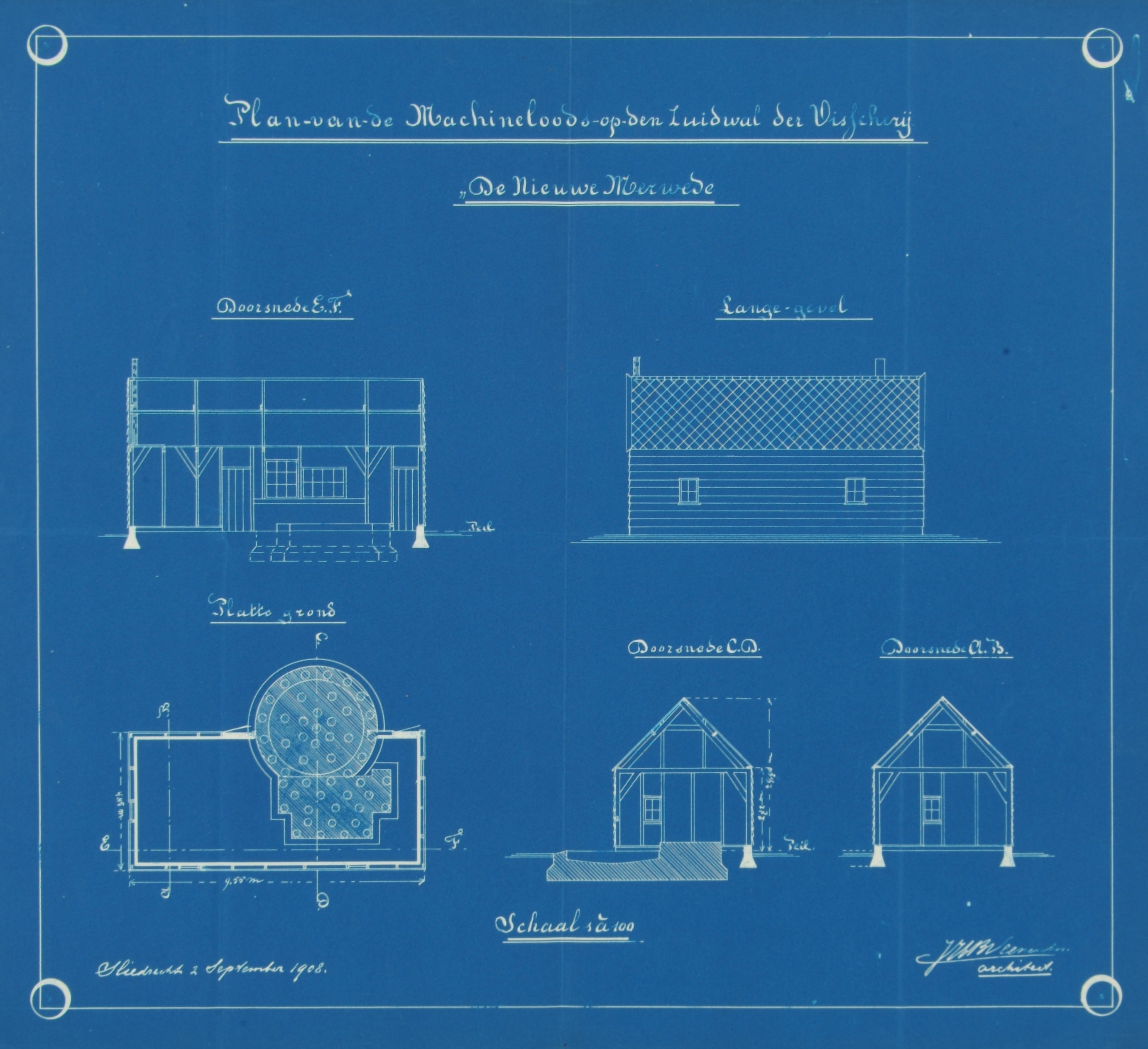 - Bouwtekening van een machineloods voor de zuidwal van zalmzegenvisserij De Nieuwe Merwede.