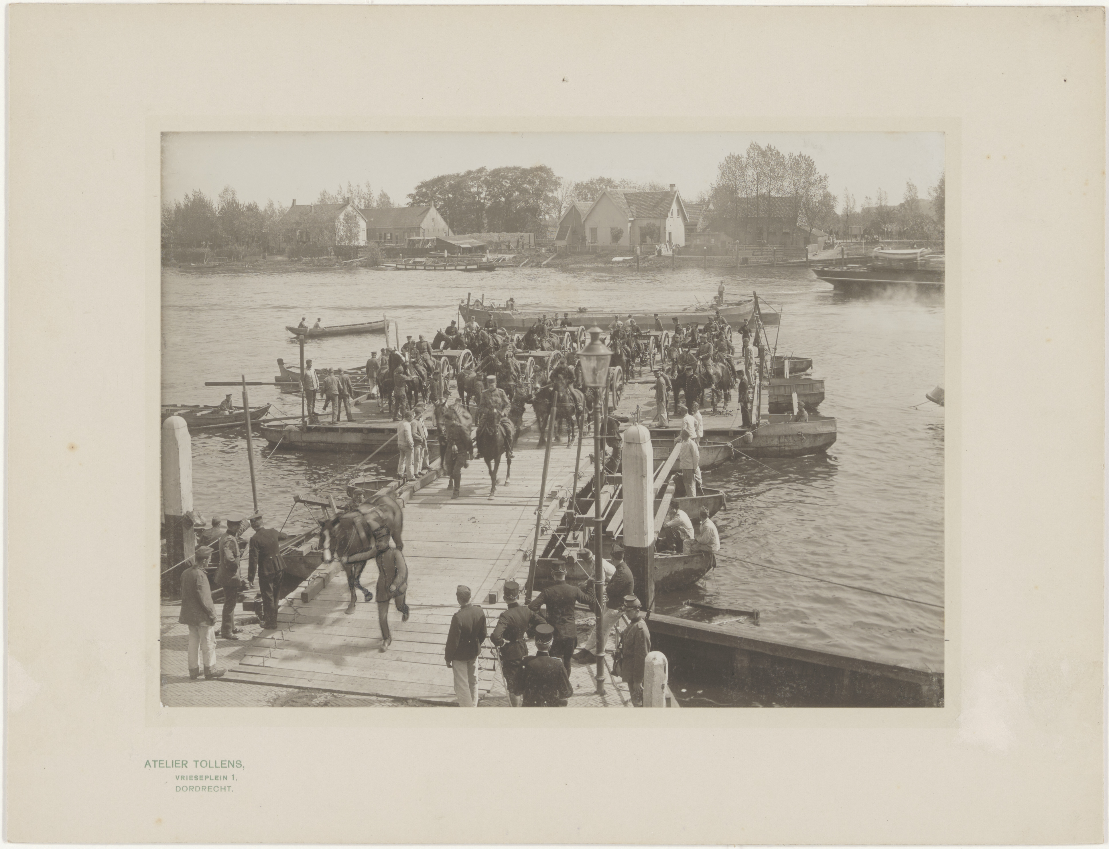 Oefeningen van het Korps Pontonniers op de Dordtsche Kil bij de veersteiger in …