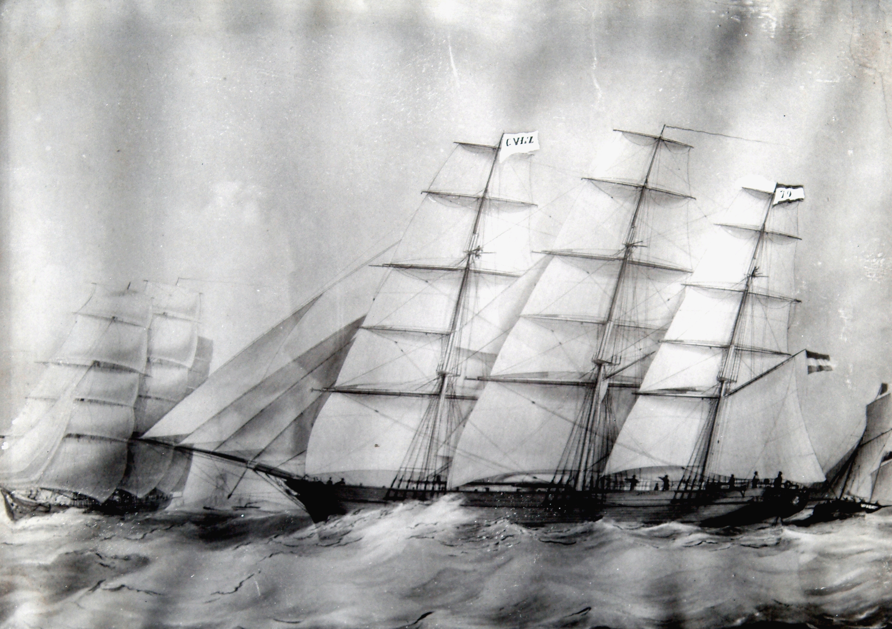 Klipperfregat Dordrecht I. Aquarel van J. Spin 1866. Eigendom van de heer J.F. Hagen, …