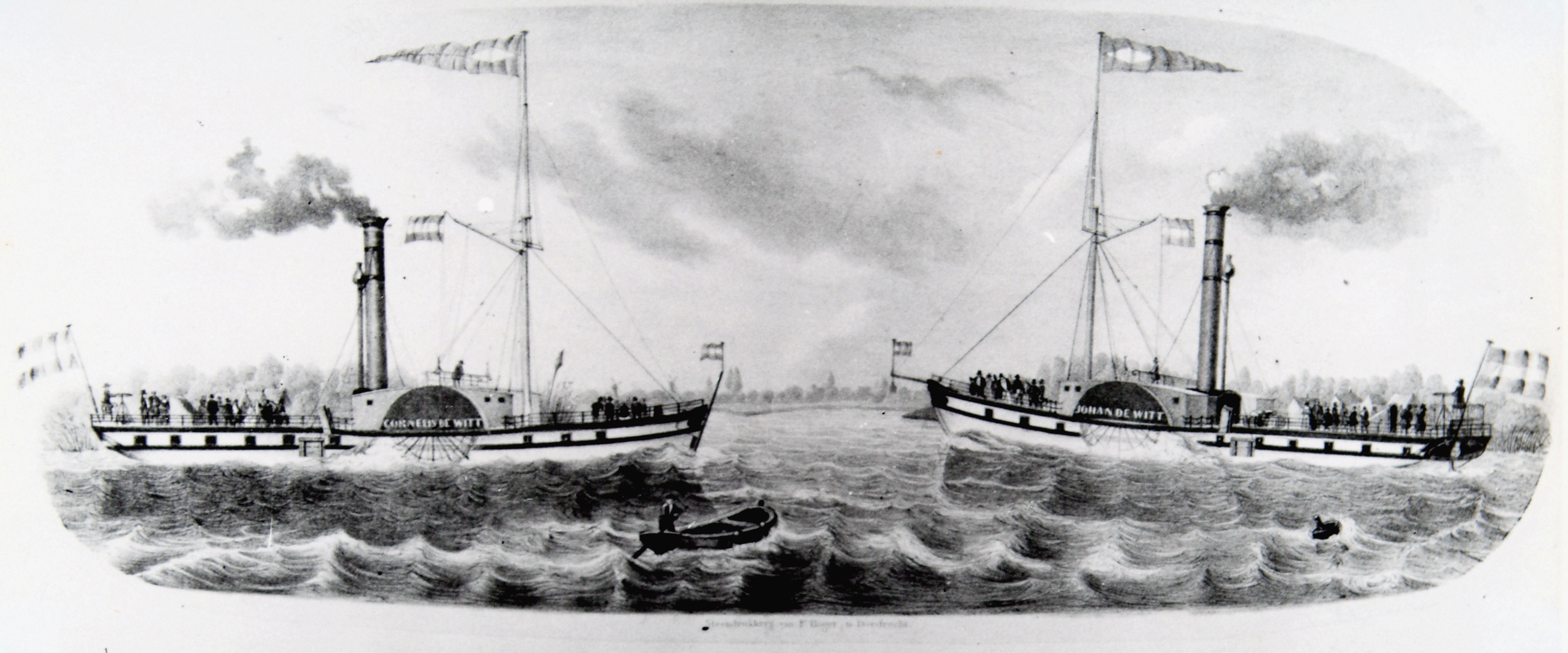 - De stoomboten "Johan en Cornelis de Witt". Litho van F. Boijer (1849). Hoofd van een dienstbiljet. Deze boten zijn resp. in 1848 en 1849 in de vaart gebracht. De eerste tussen Rotterdam en Dordrecht, de ander tussen Rotterdam en Moerdijk.