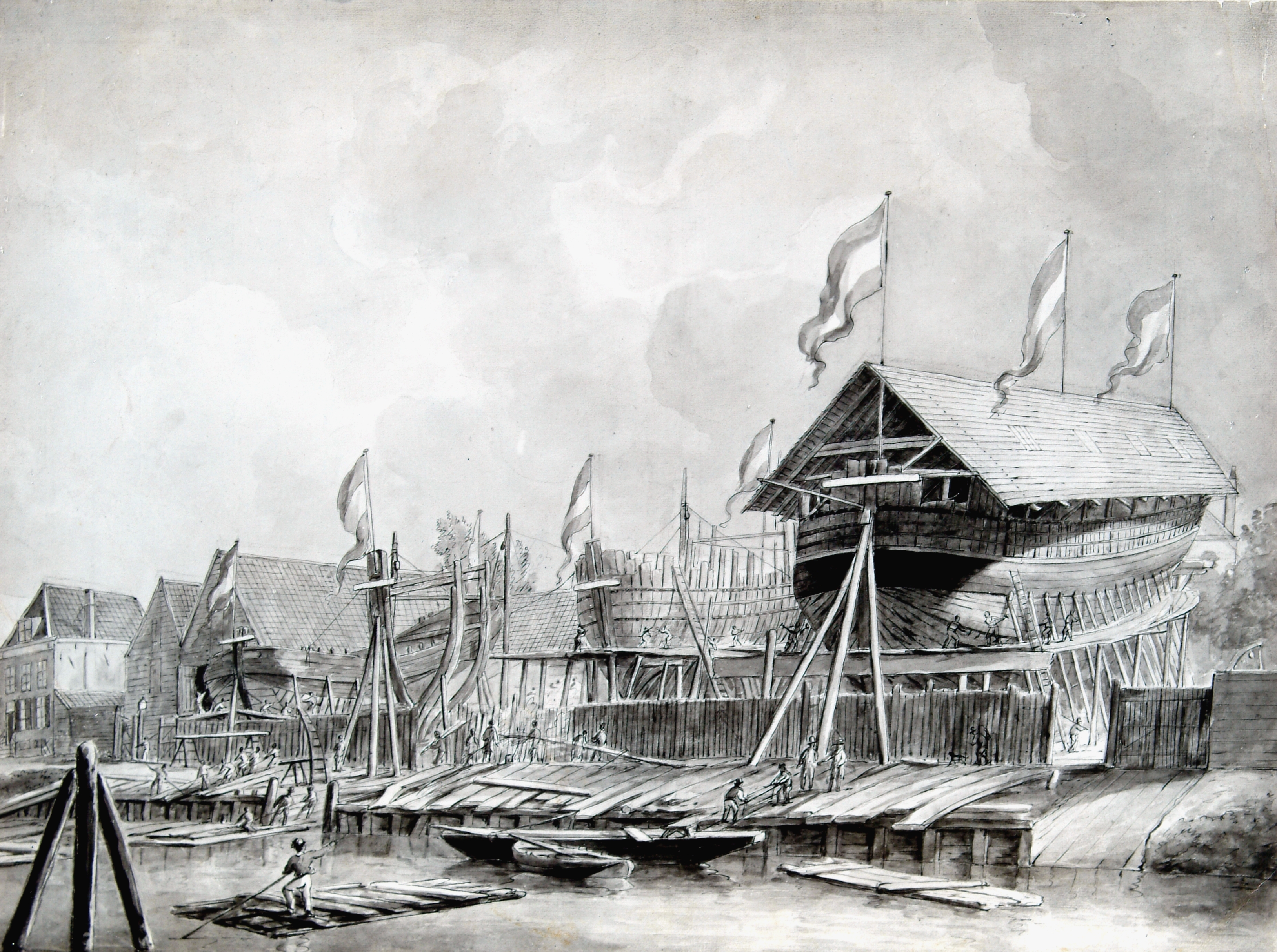 - Scheepstimmerwerf Jan Schouten in 1826, gelegen Achterhakkers op de zuidoosthoek van de Kalkhaven. De tekening in kleur is van M. Schouman, 24 augustus 1826, de verjaardag van koning Willem I. Een kopie is van E.H. Schoemaker ca. 1892. Op de werf stonden 4 schepen op stapel: fregat "Louise Prinses der Nederlanden", te water gelaten op 16 oktober 1826; de kofschepen "Christina Cornelia" en "De Harmonie", te water gelaten op 27 oktober 1826 en de brik "De Dankbaarheid", te water gelaten in 1828.