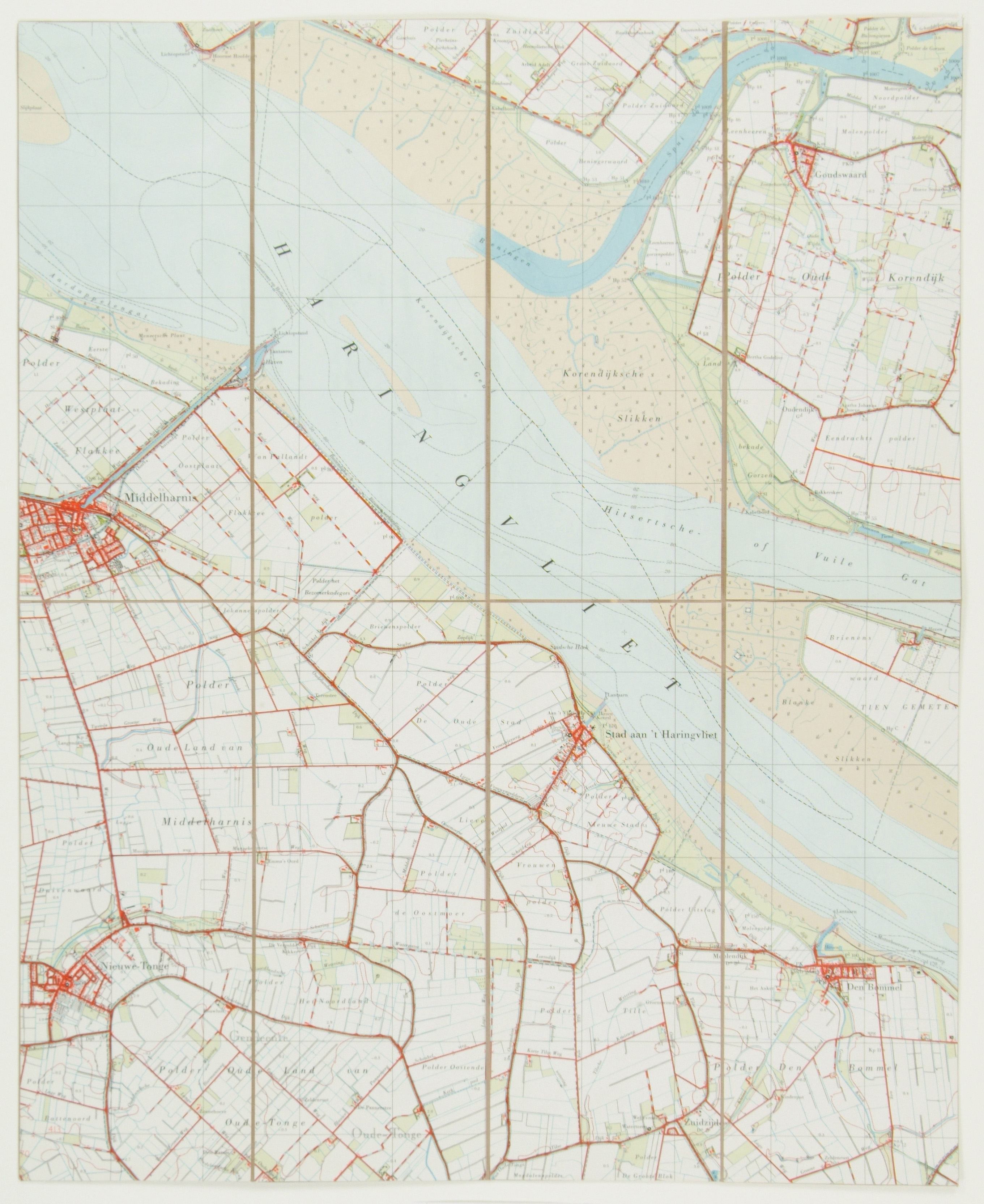 Topografische kaart Middelharnis, rechtsboven Goudswaard, rechtsonder Den Bommel, linksonder Nieuwe-Tonge, linksboven Haringvliet.