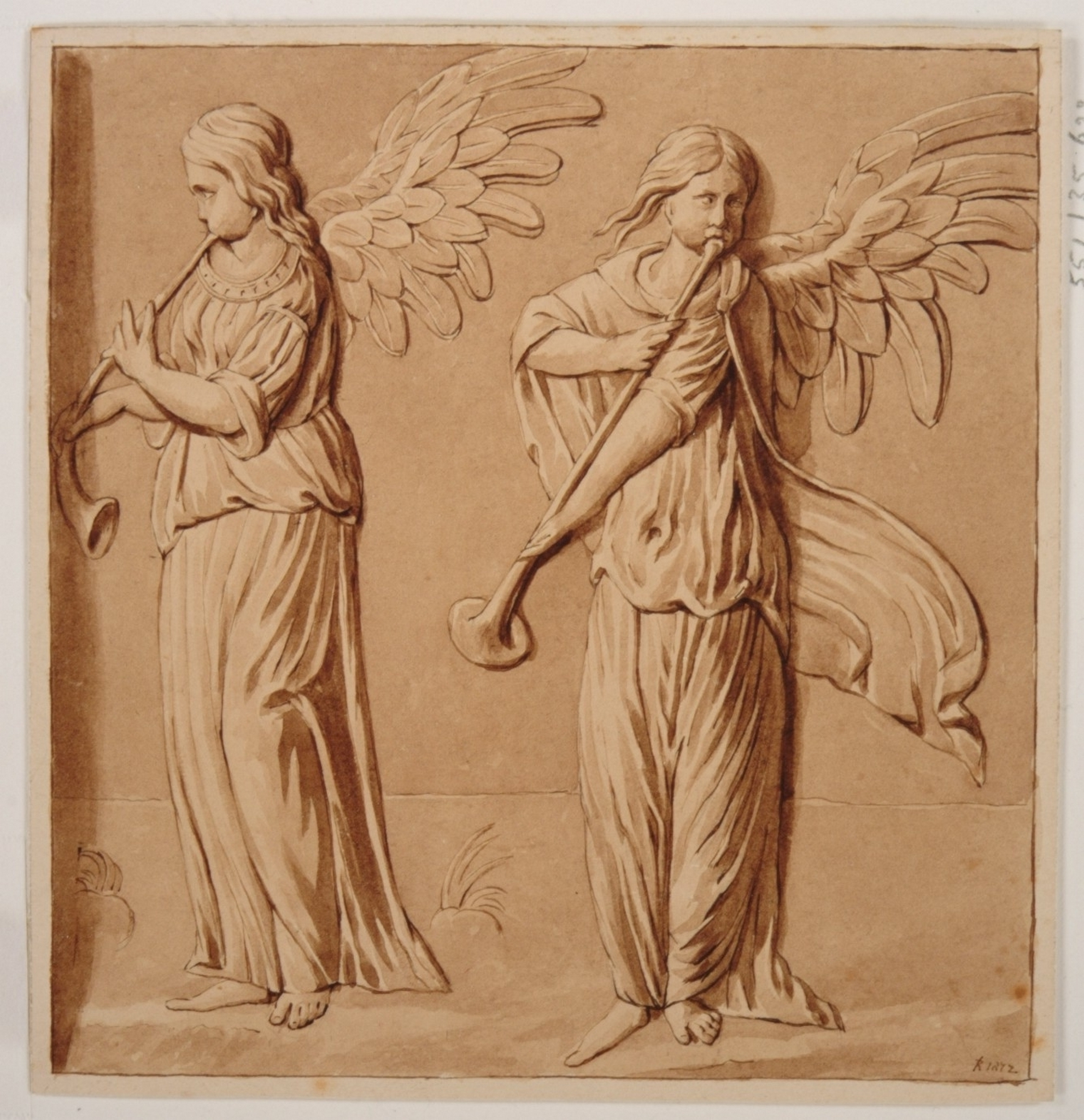 - Grote Kerk - de Koorbanken: Zuid- of Epistelzijde: 16,5 paneel in de banken aan de zuidzijde voorstellend de zegepralende kerk; paneel 1: twee bazuin blazende engelen
