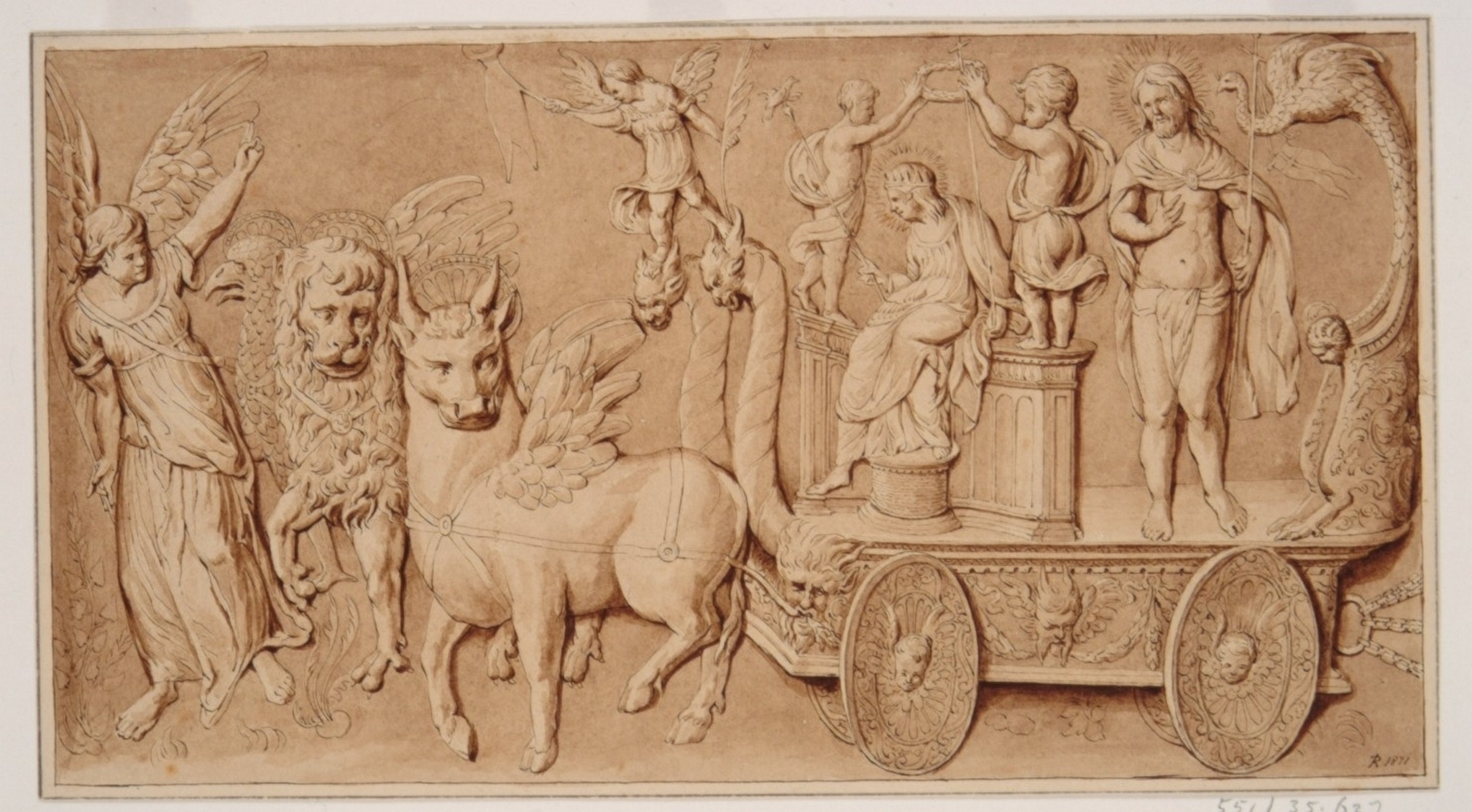 - Grote Kerk - de Koorbanken: Zuid- of Epistelzijde: 16,5 paneel in de banken aan de zuidzijde voorstellend de zegepralende kerk; paneel 6: wagen, getrokken door de evangelisten Engel, Arend, Leeuw en Os