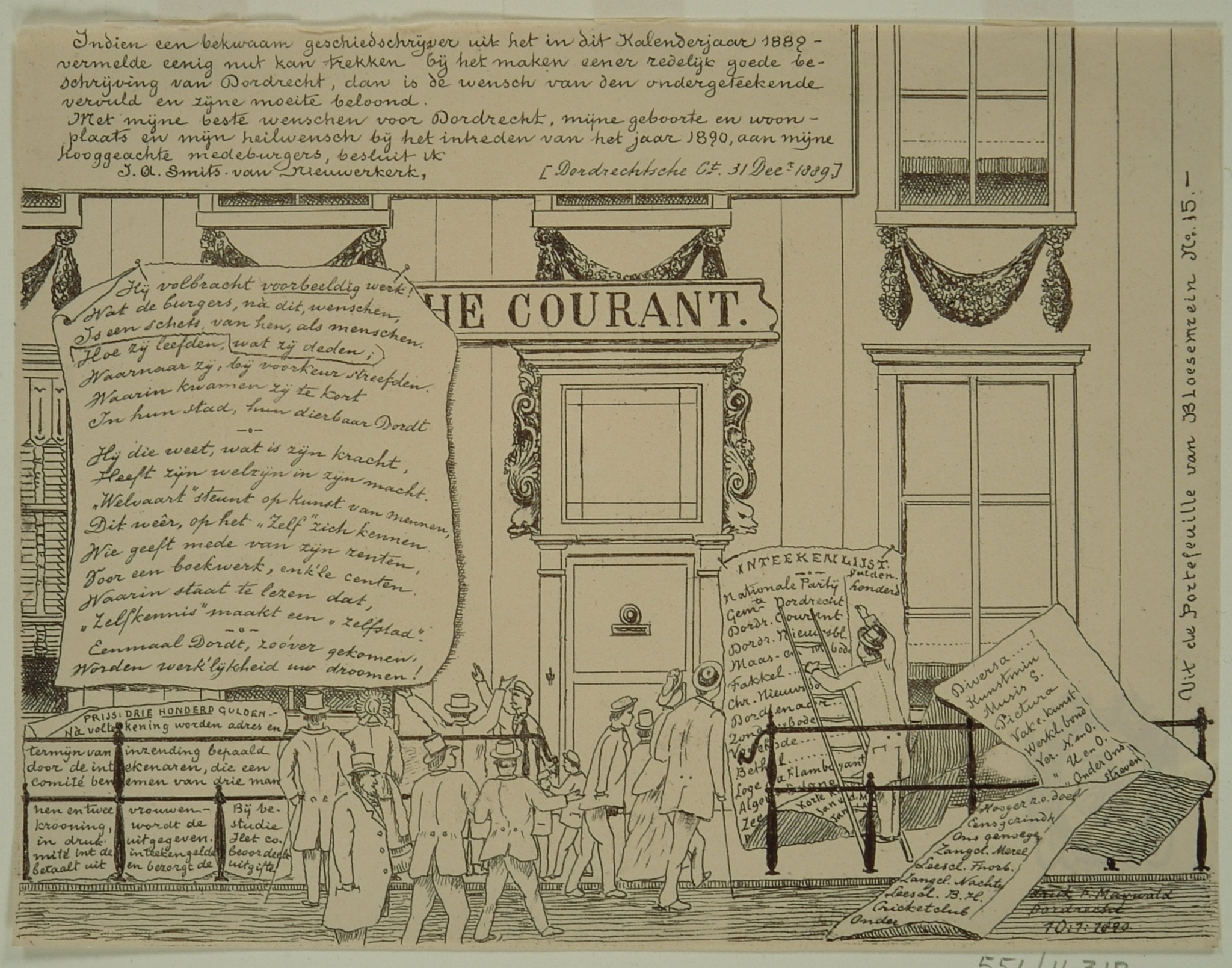 Pogingen tot volksbeschaving: het pand van drukkerij Blussé & Co., de uitgeverij van de Dordrechtsche Courant. De teksten zijn een hulde aan de heer Smits van Nieuwerkerk, die in 1889 een kroniek in de krant publiceerde over de Dordtse beschavingsgeschiedenis