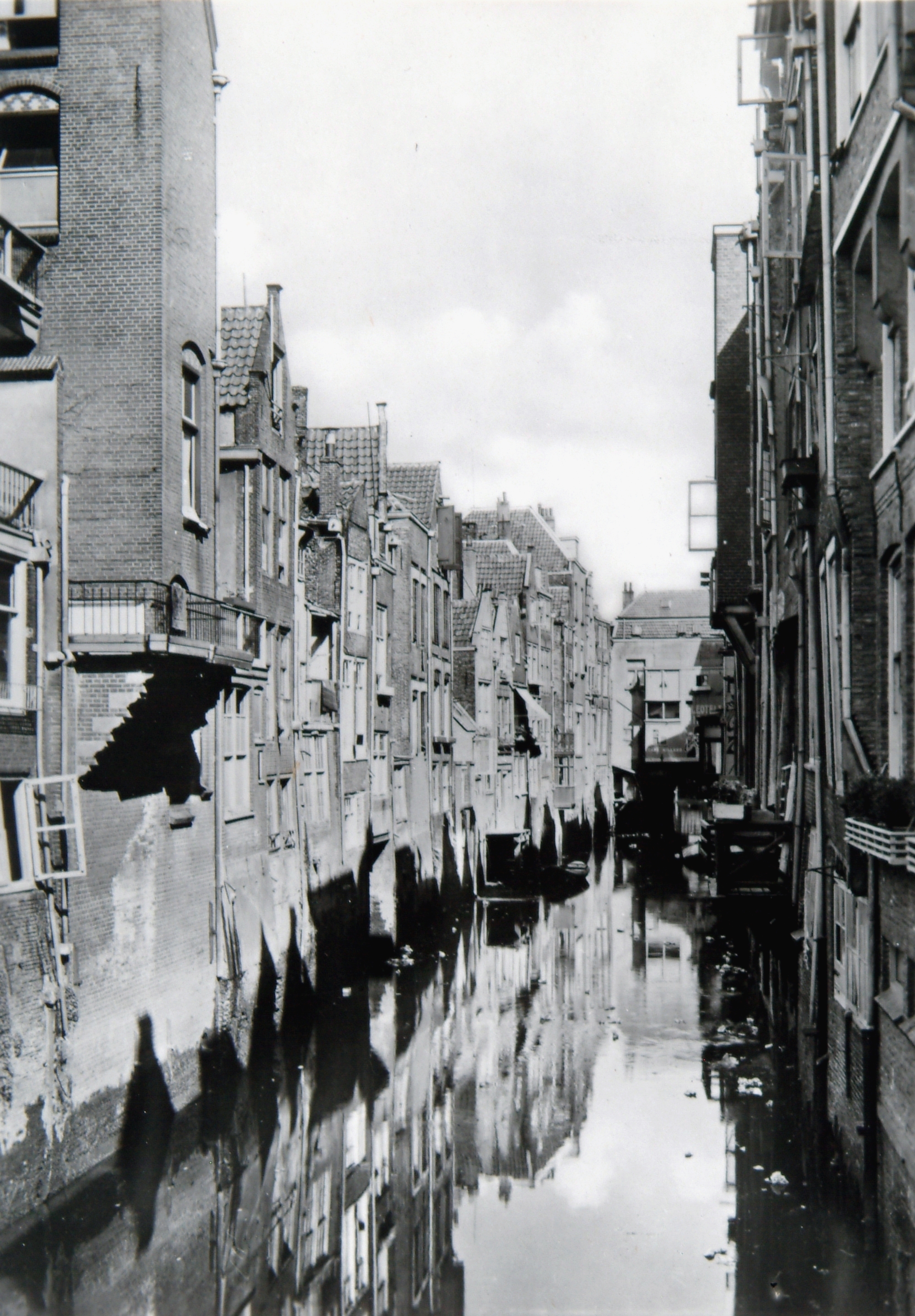 De Voorstraatshaven vanaf de Visbrug in de richting van de Tolbrug. Links de achtergevels van panden aan de Groenmarkt, rechts de Voorstraat. Op de achtergrond boven de Tolbrug de achterkant van een café.