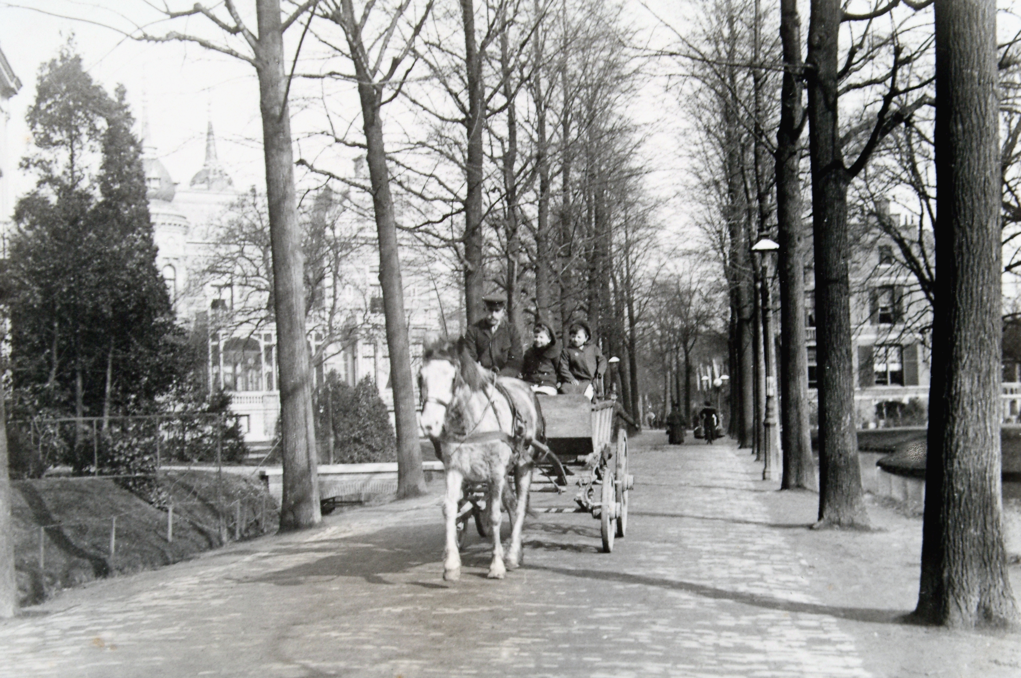 In de verte de zes huisjes vormend het Koningspleinbuurtje op de hoek van de Hallincqlaan. Afgebroken in 1909 t.b.v. Soekasaki.