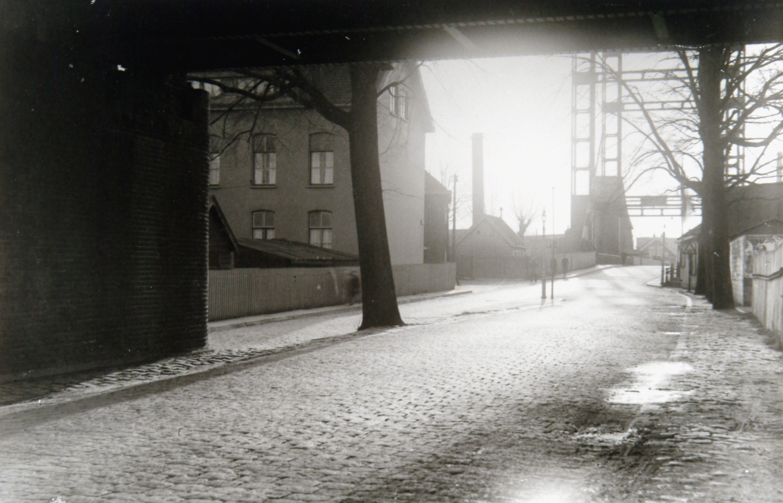 - De Dokweg en de Dokbrug gezien in de richting van de 's-Gravendeelsedijk. Op de voorgrond de onderkant van het spoorweg viaduct, rechts de Dokbrug met daarachter het silhouet van molen De Pelikaan.