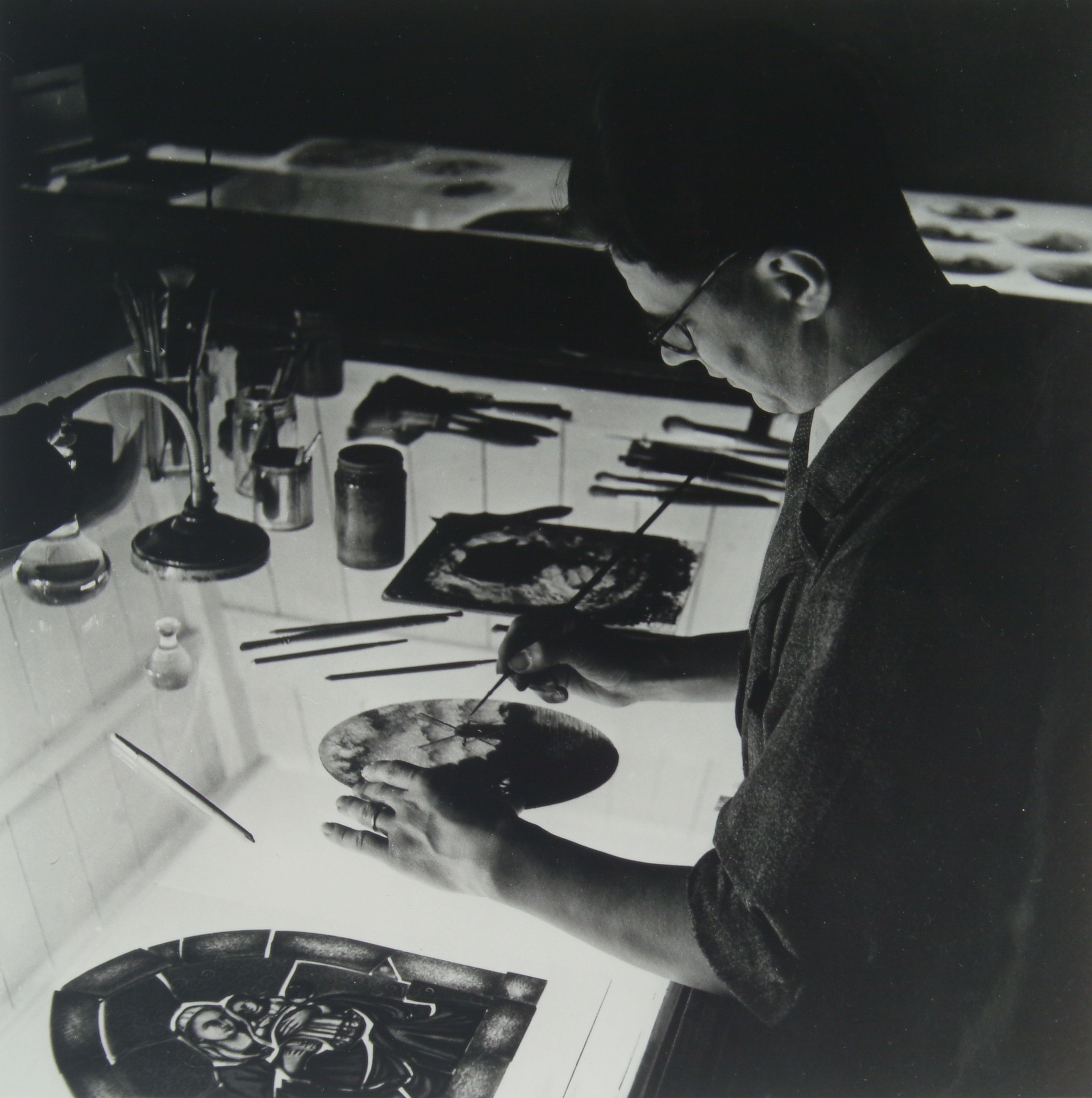 P. Korstanje beschildert glas-in-loodramen voor de Dordtsche Glashandel aan de …