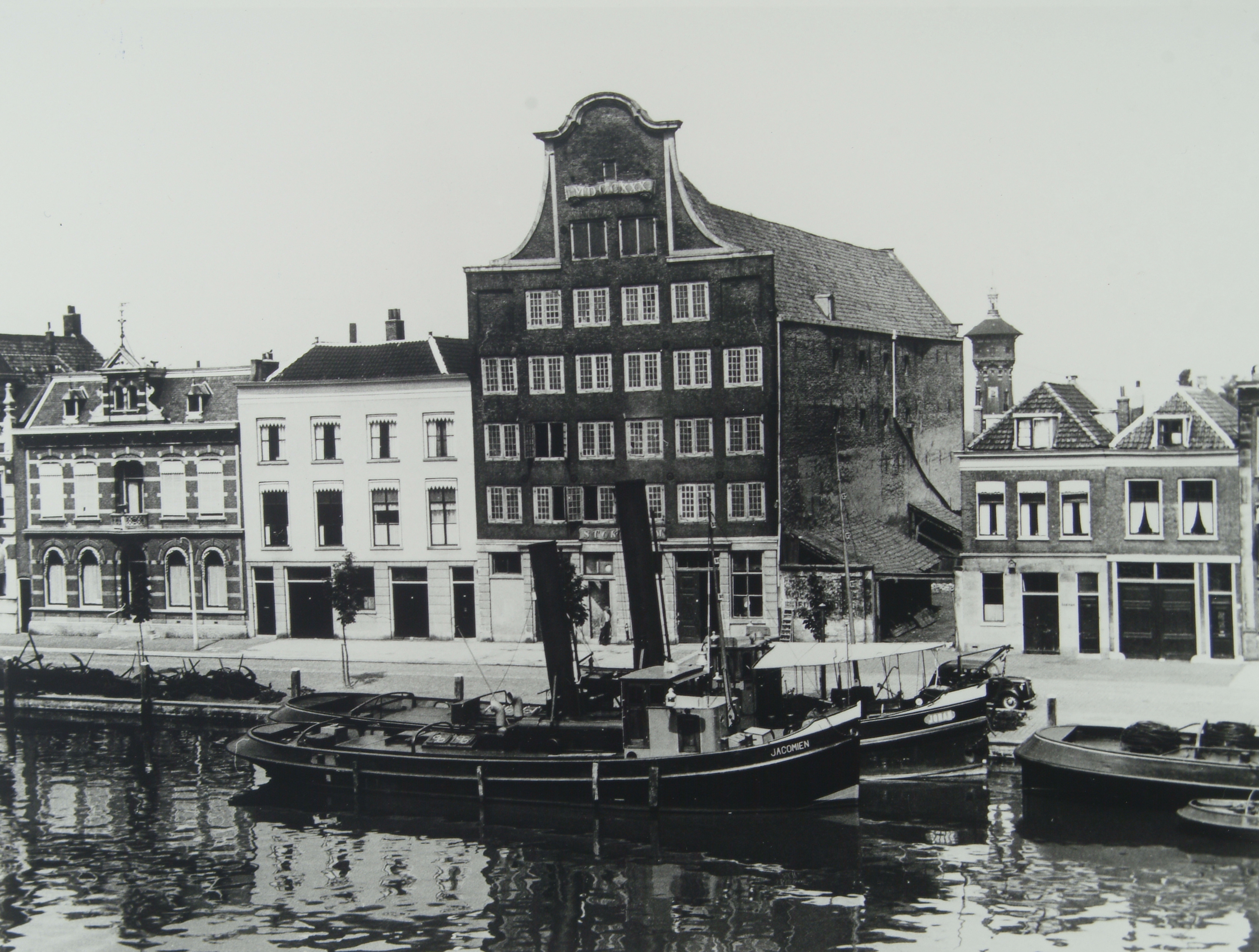 Wolwevershaven met centraal pakhuis Stokholm. Gezien uit de Dordtsche Glashandel aan de Kuipershaven