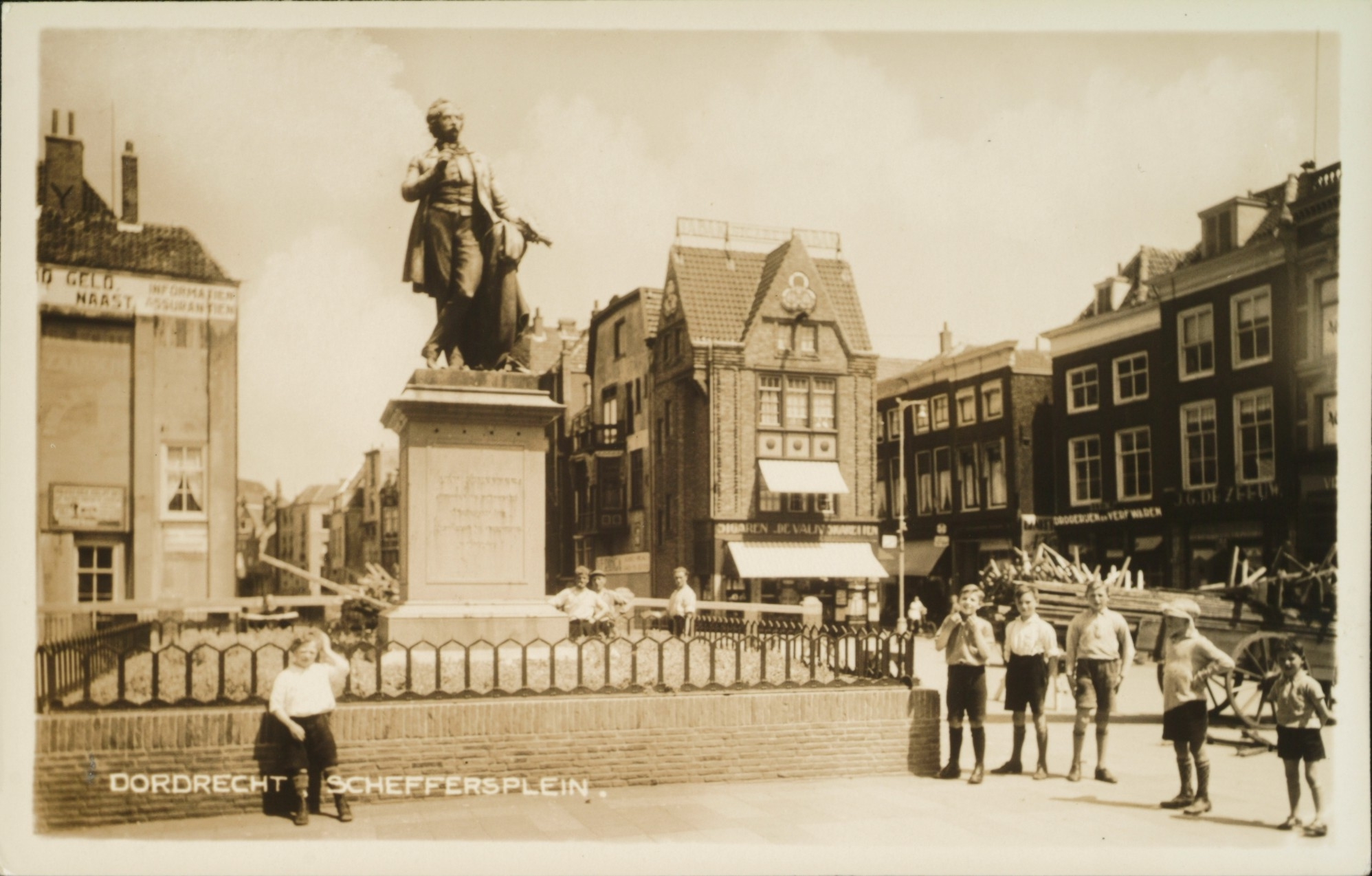 - Het Scheffersplein met het standbeeld van Ary Scheffer omstreeks 1936. Rechts de Voortsraat.