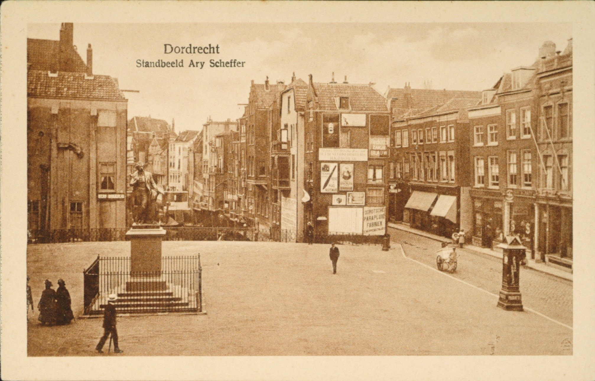 Het Scheffersplein met het standbeeld van Ary Scheffer omstreeks 1910. Op de achtergrond de Wijnhaven en rechts de Voorstraat.