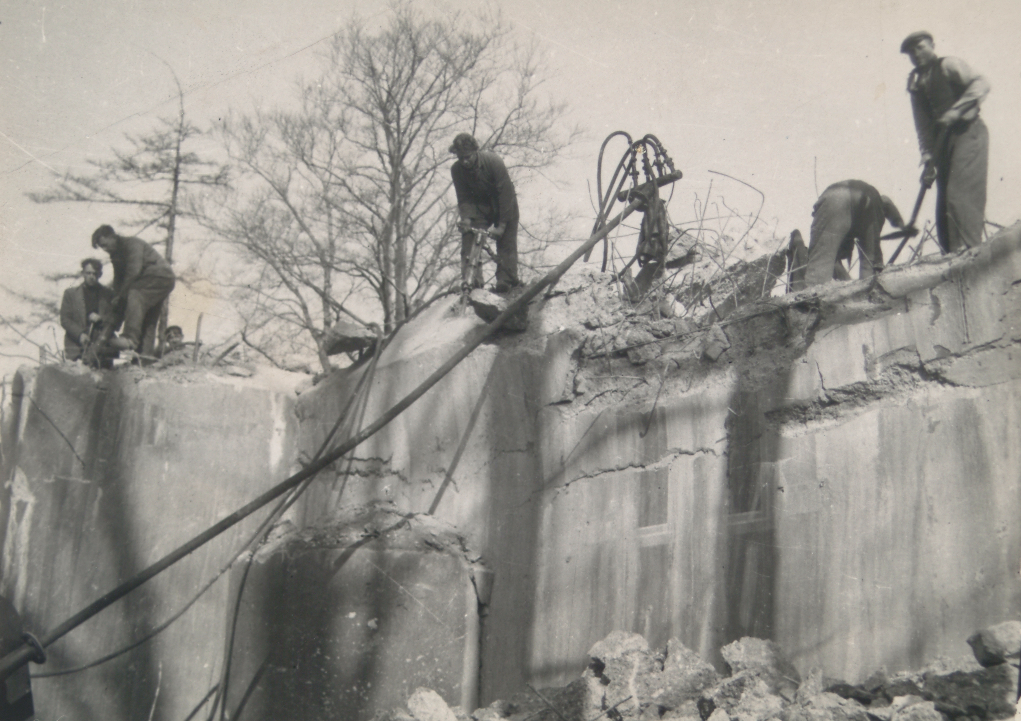 In Park Merwesteijn zijn in 1942 (met inzet van Nederlandse aannemers en Joodse gevangenen uit subkamp Moerdijk van Kamp Vught) vijf bunkers gebouwd. Zij dienden van 1942 tot september 1944 voor het onderbrengen van de generale staf van de 719e Infanterie Division. Dit legeronderdeel was belast met de bouw en bemanning van de Atlantikwal in de sector tussen Goeree-Overflakkkee en Den Haag. De bunkers dienden alleen als onderkomen tijdens krijgshandelingen, normaal verbleef de operationele staf in barakken die naast de bunkers werden opgericht, in School Muhring, de HBS en gevorderde villa's aan de Vrieseweg en De Singel. Er zijn 4 verschillende type bunkers in het park gebouwd, allen in de zwaarste (STandige) uitvoering van 3 a 4 meter dik beton: Twee stuks R 608: gefechtstand voor de Generale staf van de divisie en Gefechtstand voor het 723e Infanterie Regiment; R 610: Gefechtstand voor het 743e Grenadier Regiment; R 622: Doppelgruppen Unterstand (Personeelsonderkomen R 618: Nachrichtenstand (telecommunicatiecentrum) voor de 719e Nachrichten Abteilung. Tevens zijn in het park en achter School Muhring betonnen bergplaatsen en schuilkelders gebouwd. De barakken en het manschappencasino in de villa zijn bij het bombardement op het (toen al door de 719E ID. verlaten) hoofdkwartier in september 1944 verwoest dan wel zwaar beschadigd. In 1946 zijn in het kader van een tewerkstellingsproject van werklozen de bunkers en overige werken in het park handmatig gesloopt en geruimd. De foto geeft een beeld van deze werkzaamheden. Het vrijgekomen puin is grotendeels gebruikt voor de fundering van de paden in het Weizigtpark. Plattegronden van de bunkers en werken hangen in Museum 1940-1945 aan de Nieuwe Haven.
