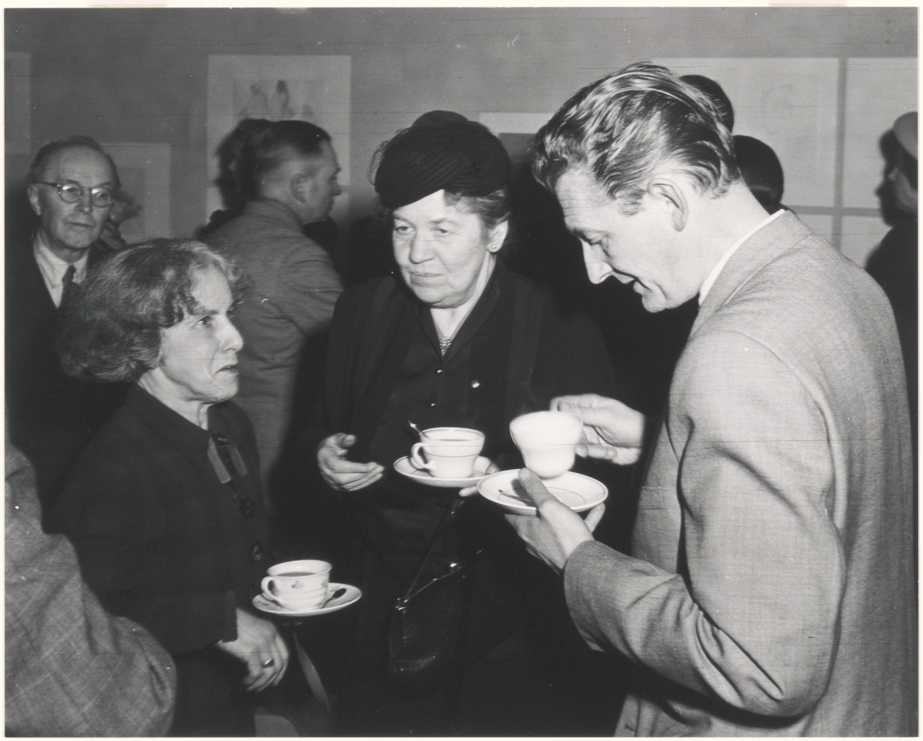 - De schrijvers Marie Schmitz, Top Naeff en Simon Carmiggelt in gesprek en koffiedrinkend op de opening van een tentoonstelling van werken van Otto Dicke in gebouw Pictura.