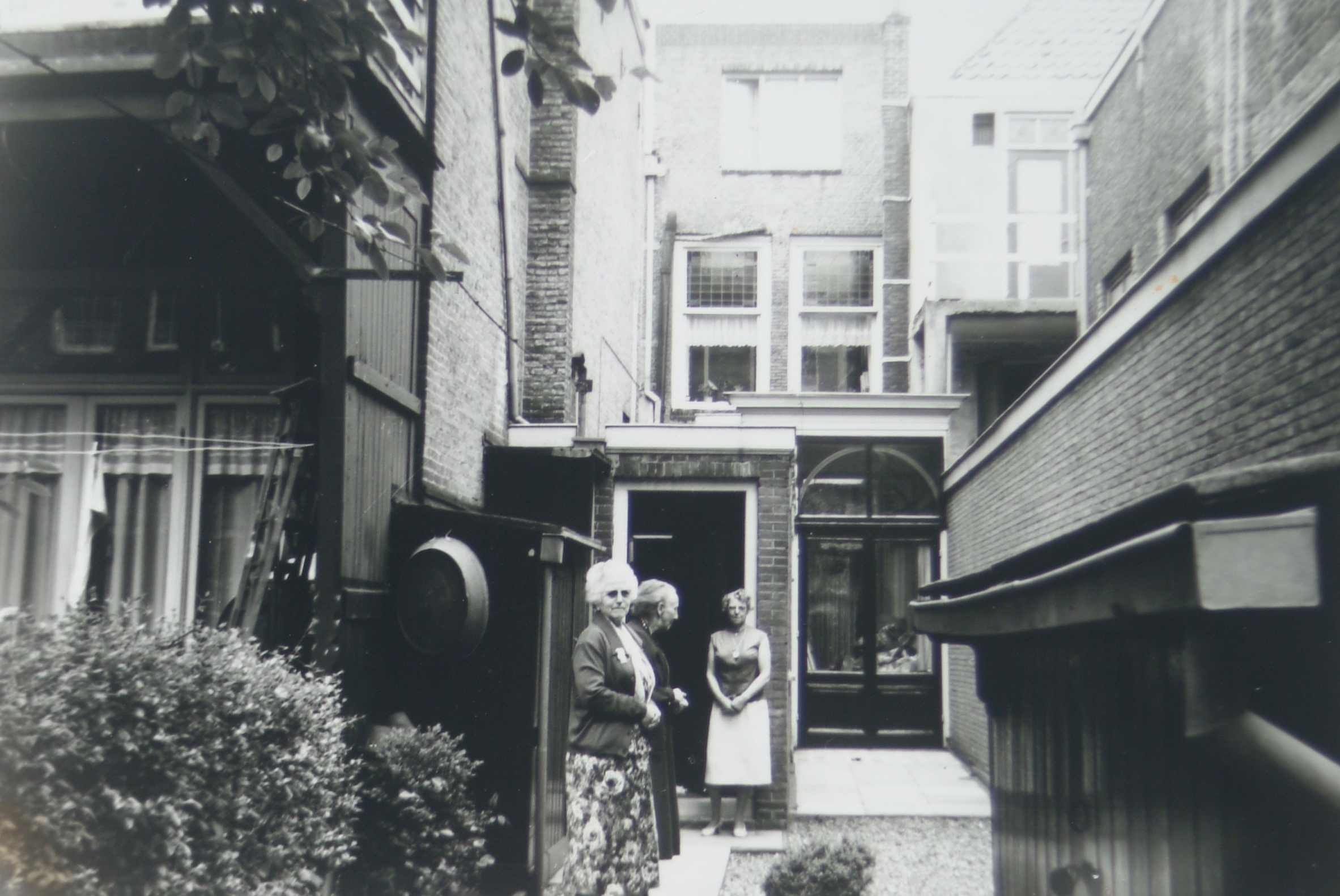- Achterzijde winkel in woningtextiel A.J. Claessen aan het Steegoversloot. Voor de deur staan Keetje, Jans en Pietje Bos die boven de winkel woonden.