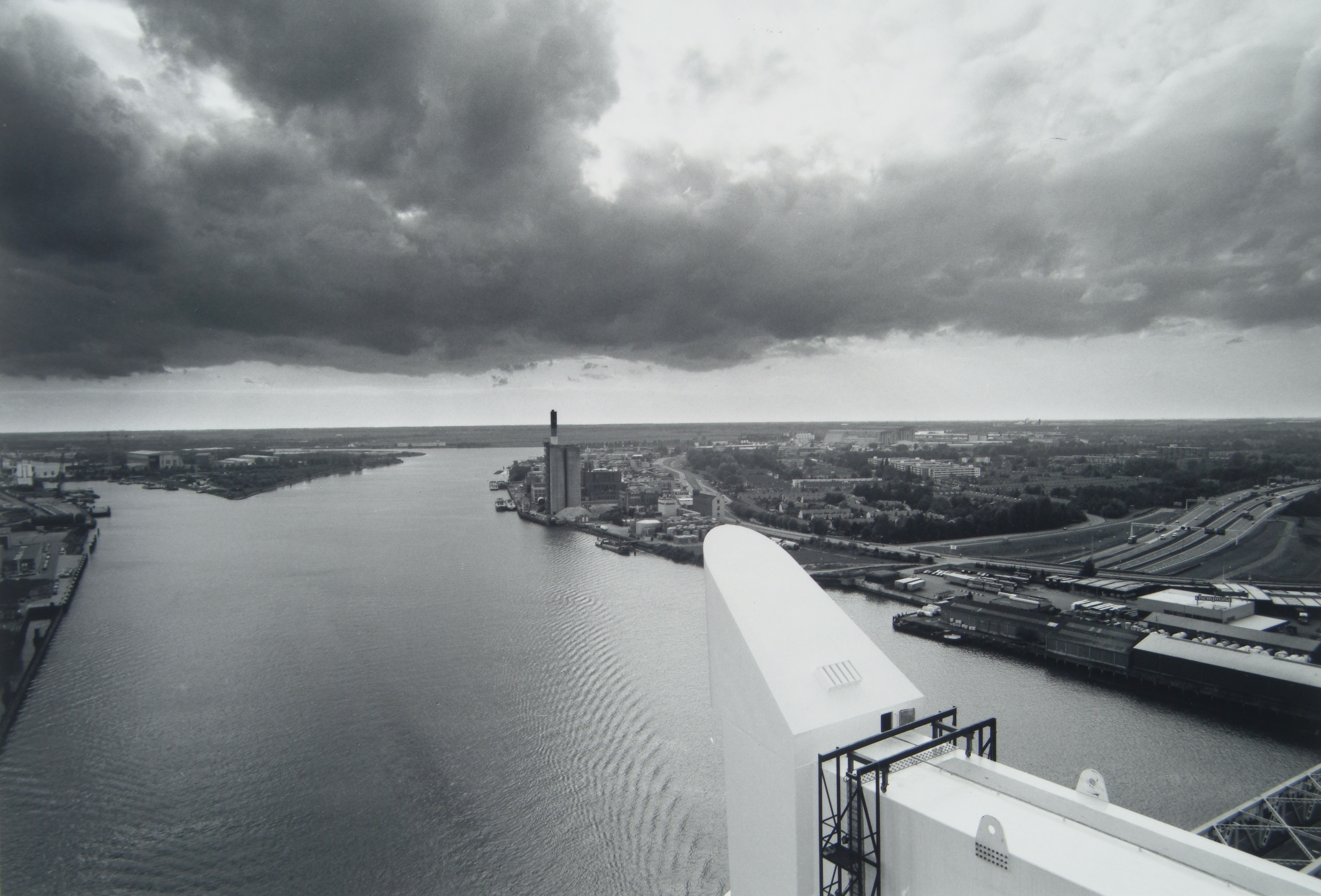 Panorama vanaf de Zwijndrechtse spoorbrug, in aanbouw, over de Oude Maas. Gezien naar Krabbegors