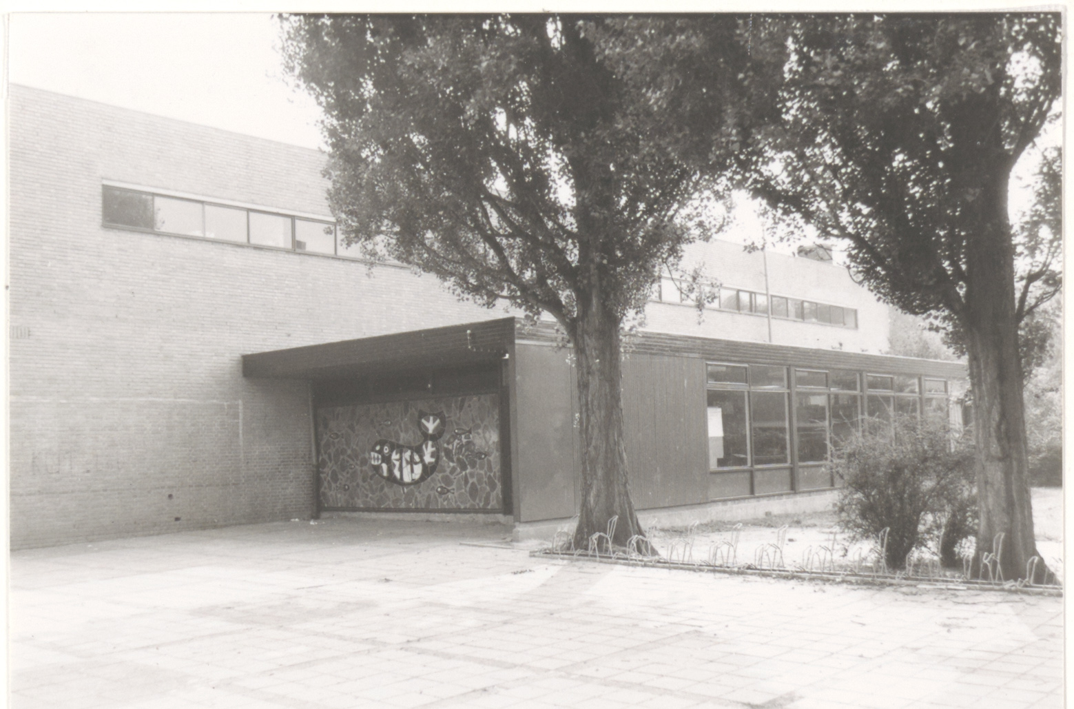 - Het vis-mozaiek bij de ingang van de RK-basisschool Don Bosco aan de Dresselhuysstraat.