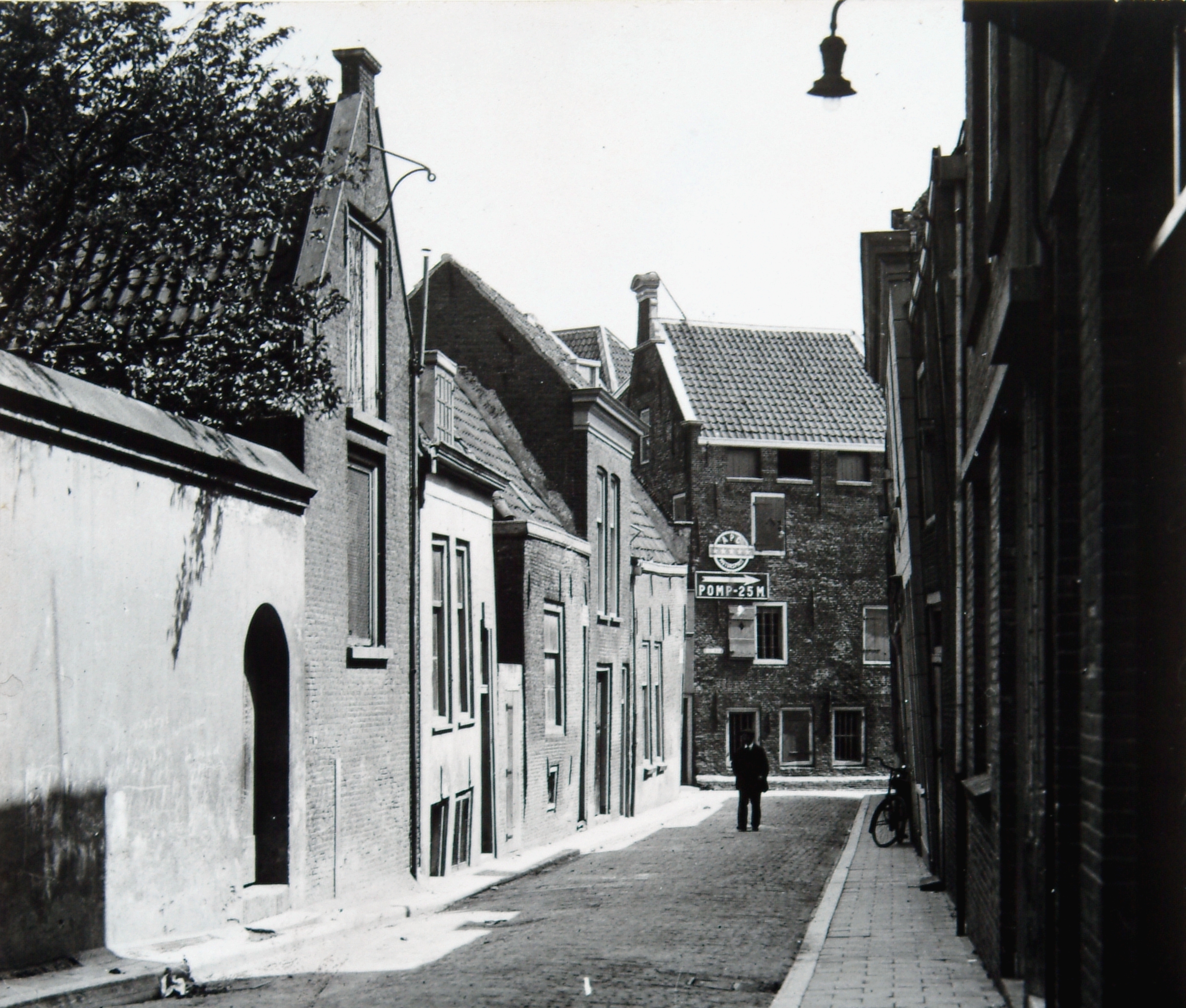 - Het Slikveld gezien in de richting van de Suikerstraat en Boogjes. Links vooraan de muur van het Diaconessenhuis. Het reclamebord verwijst vaar de benzinepomp van garage Blom in de Boogjes.