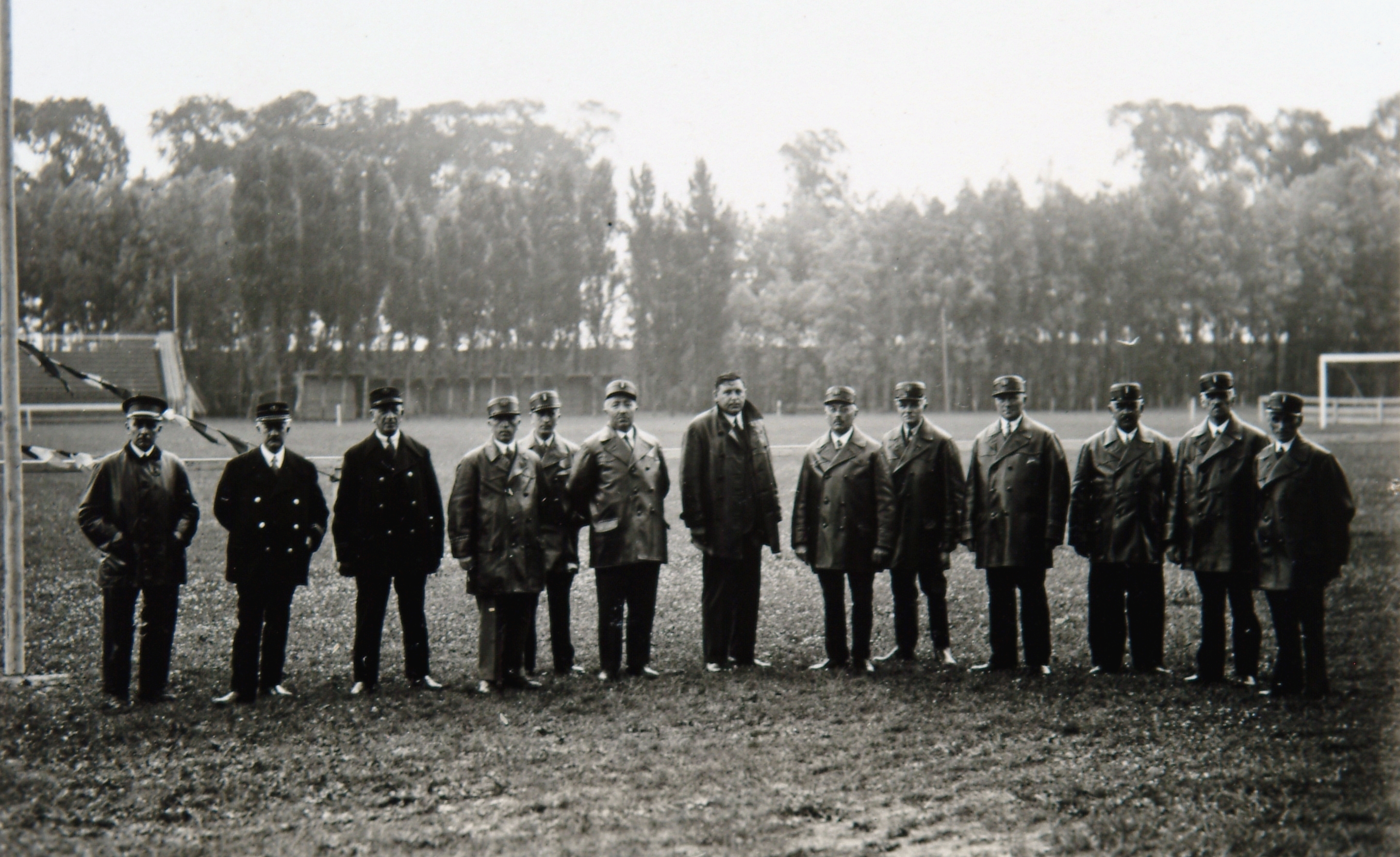 Brandweeroefeningen op het Sportpark aan de Reeweg met brandmeester De Graaf en zijn ploeg. Op de achtergrond de Noordendijk.