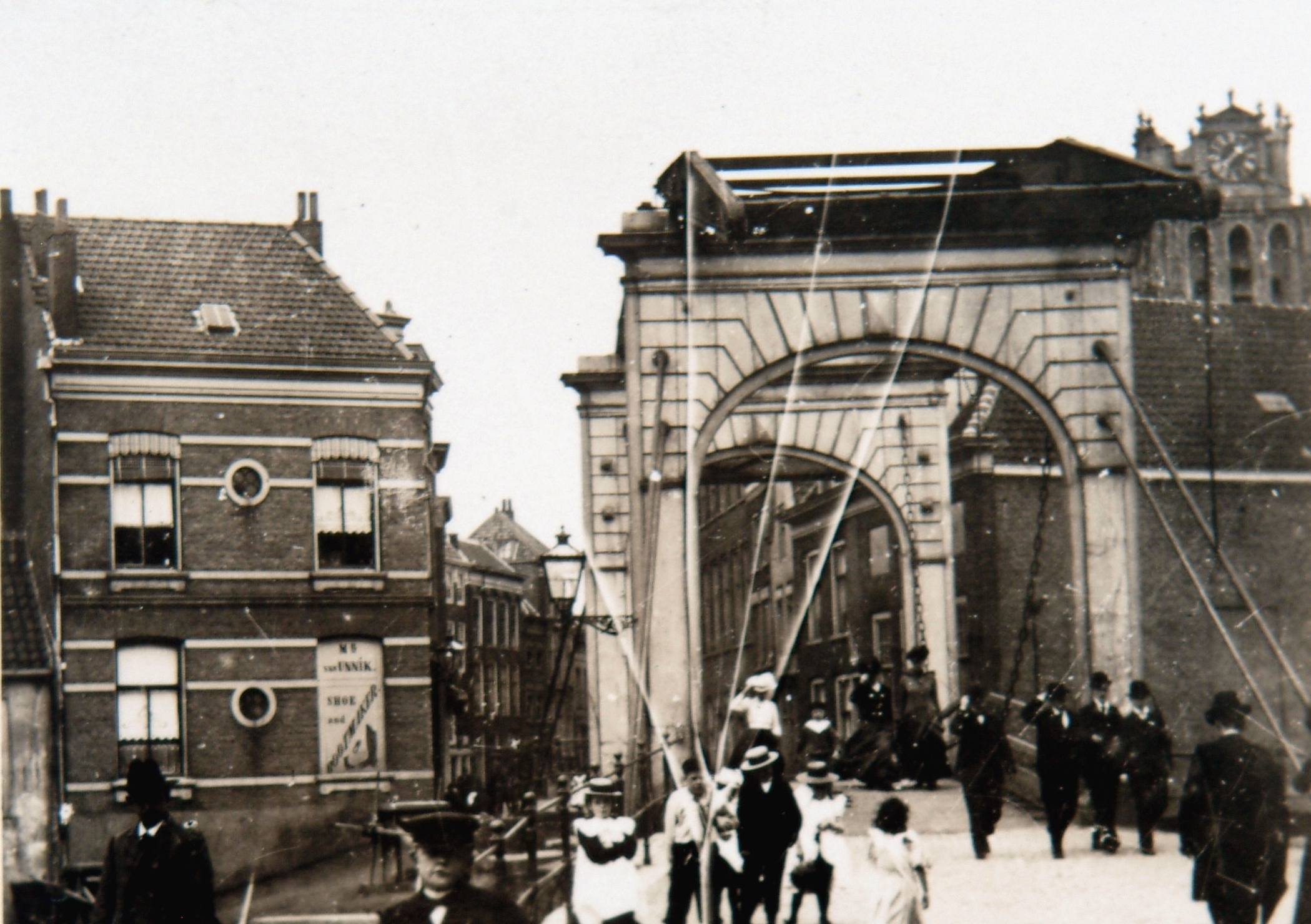De Sluisbrug vanaf de Sluisweg in de richting van de Prinsenstraat. Het pand links staat op de hoek Prinsenstraat/Kleine Kalkstraat.
