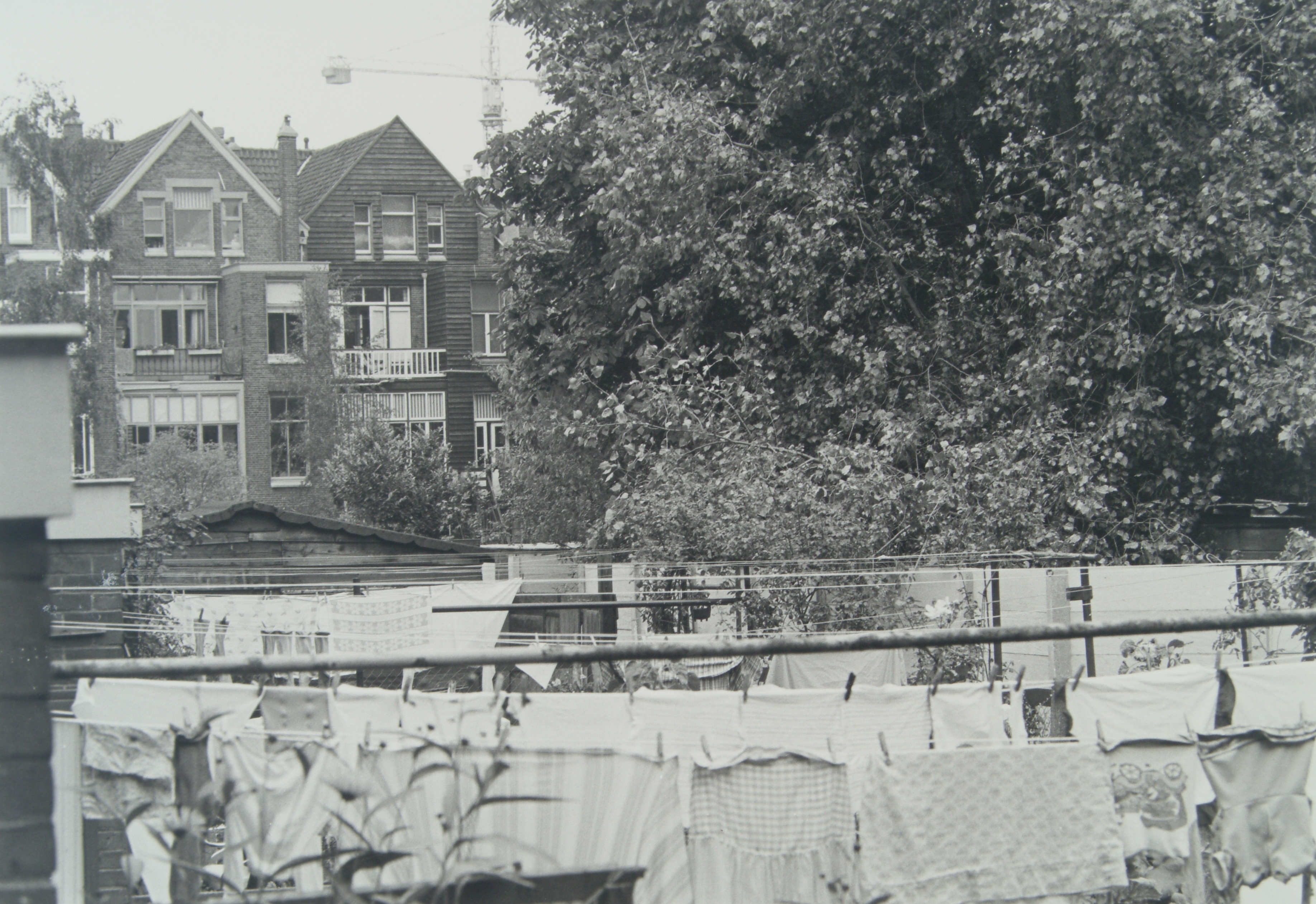 - Achtertuinen met drogend wasgoed in de hoek van de Hoge Bakstraat (links) en de Van Strijsingel.