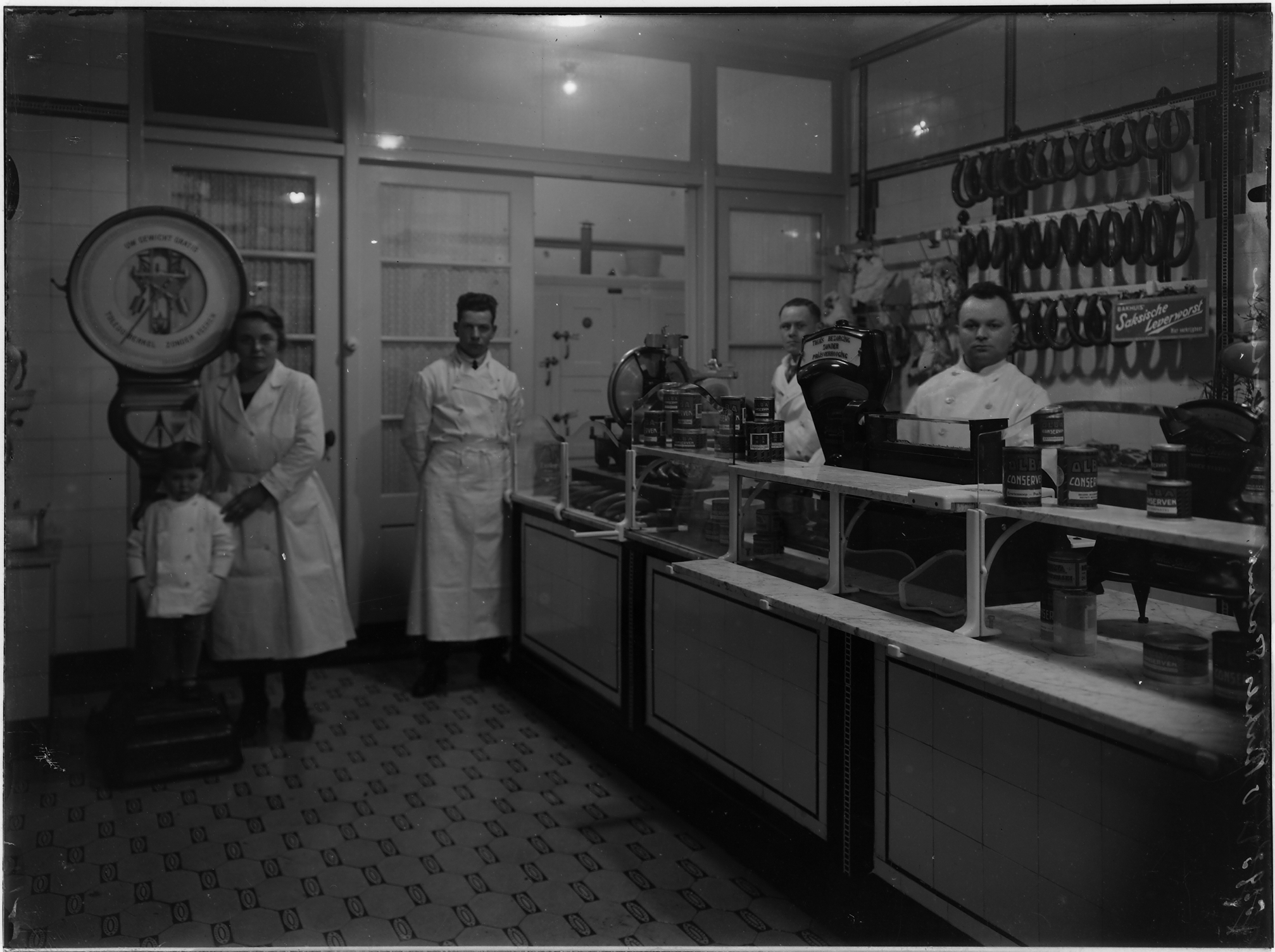- Interrieur slagerij met personeel enweegschaal Toledo-Berkel