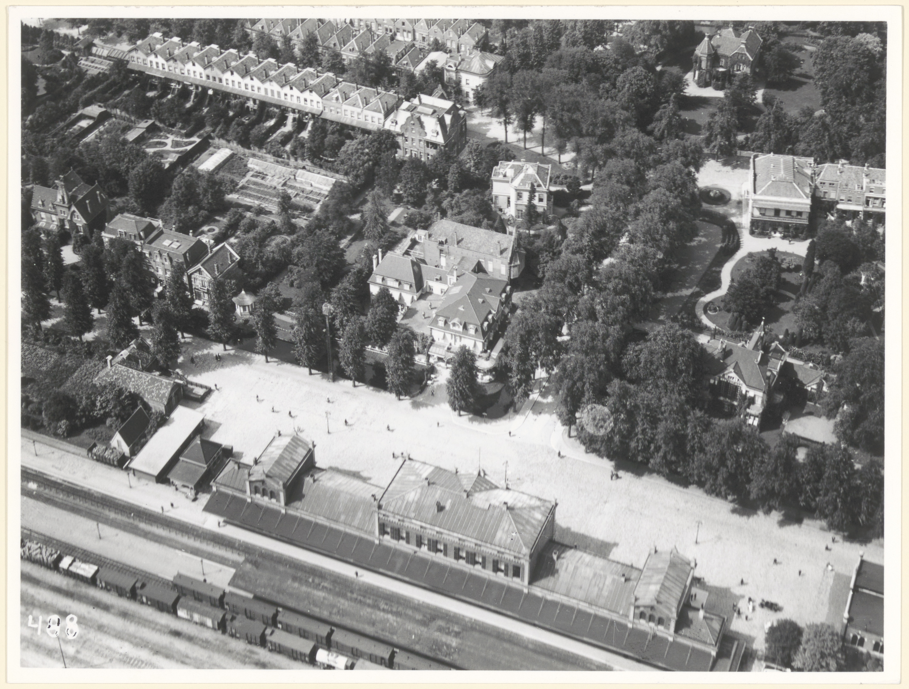 - Luchtfoto van het station naar het noorden. In het midden hotel Ponsen aan de Stationsweg, rechts villa Simpang en linksboven de Albert Cuypsingel.