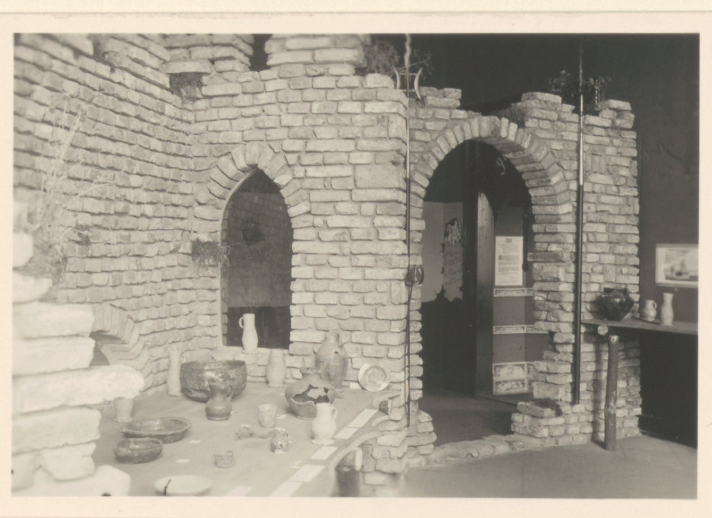 Een brok ruïne, opgetrokken uit stenen van het Huis te Merwede, en opgegraven voorwerpen, op de tentoonstelling Groeiend Dordt in het Dordrechts Museum in de Museumstraat.