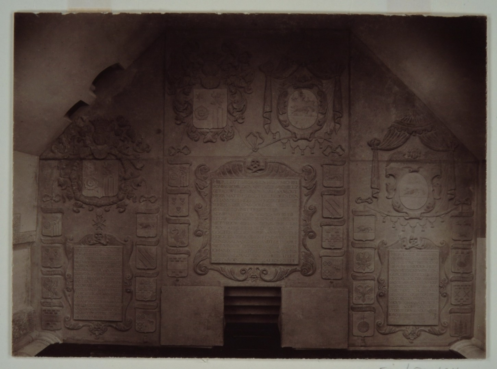 hxb: 16,5 x 22,5 cm De figuren op de sedert 1795 gladgehakte wapenschilden werden in 1912 op last van de beheerder van de kapel door beeldhouwer Ed. Moermond opnieuw aangebracht